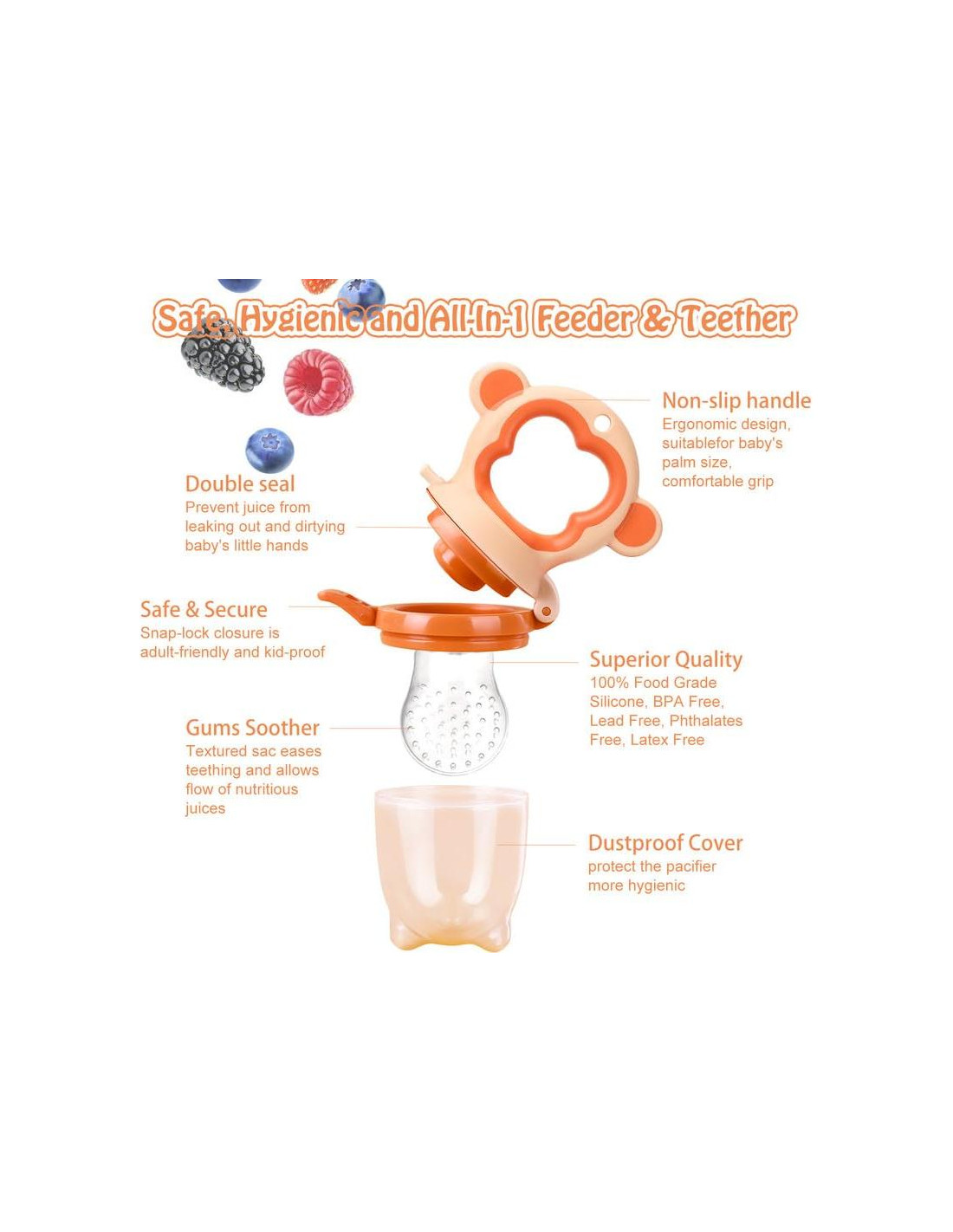 - [DISEÑO DE CIERRE EMBEBIDO] El chupete para dentición de frutas HAOBAOBEI está diseñado con un cierre de anillo de sellado incorporado, sellado doble de 360 para prevenir derrames, se sella firmemente y es difícil de abrir. El diseño único de nuestro chupete alimentador para bebés puede prevenir eficazmente que el jugo se derrame por una apertura accidental por parte del bebé, lo que puede proteger la salud e higiene del bebé.