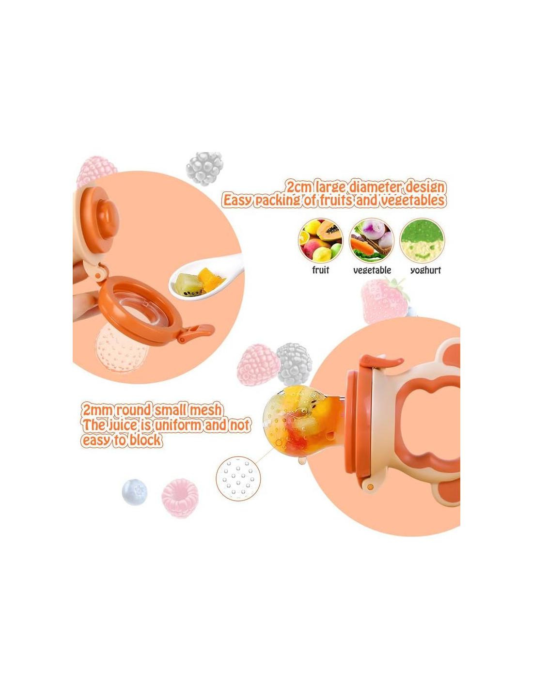 - [AGUJEROS DE BOLSA DE SILICONA SEGURA] El alimentador de frutas para dentición HAOBAOBEI está hecho de silicona 100% de grado alimenticio. Libre de BPA. Libre de plomo, ftalatos y látex. Agujero de bolsa de silicona de 2 mm, el jugo es uniforme y no se bloquea fácilmente. Cuando el bebé muerde el chupete, la comida entra en la boca del bebé en forma de gotas finas y digeribles, lo que no ahoga al bebé y evita el riesgo de asfixia.