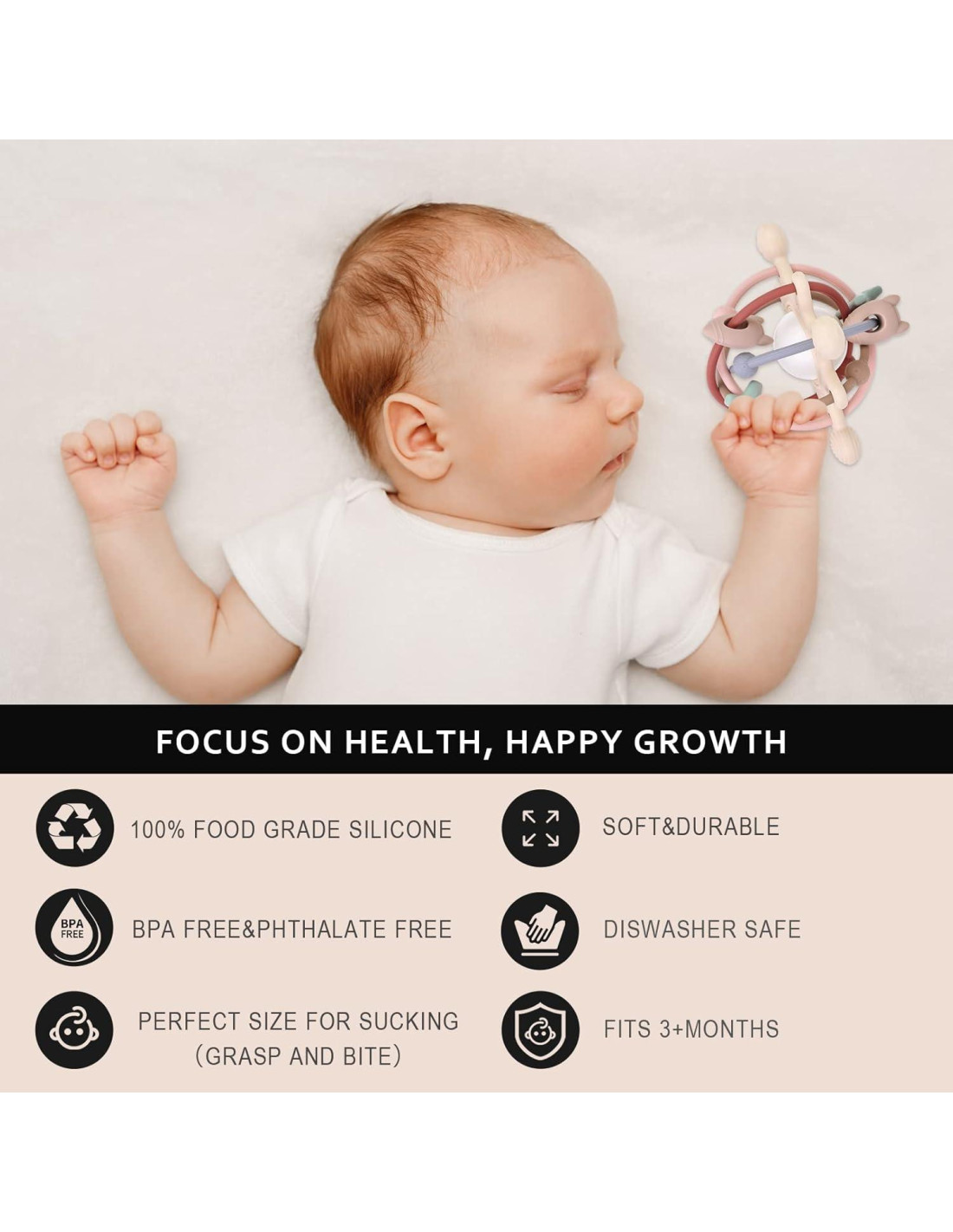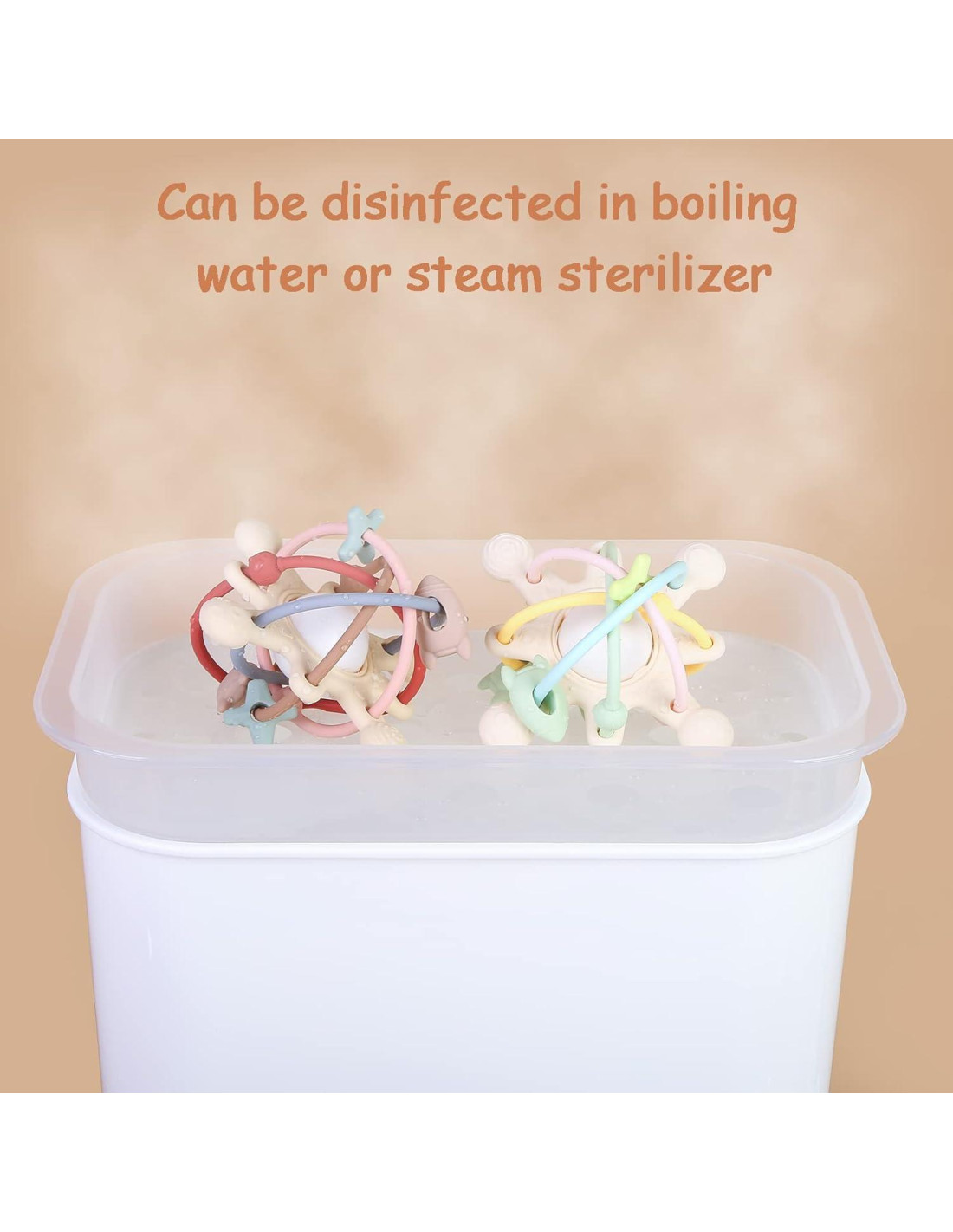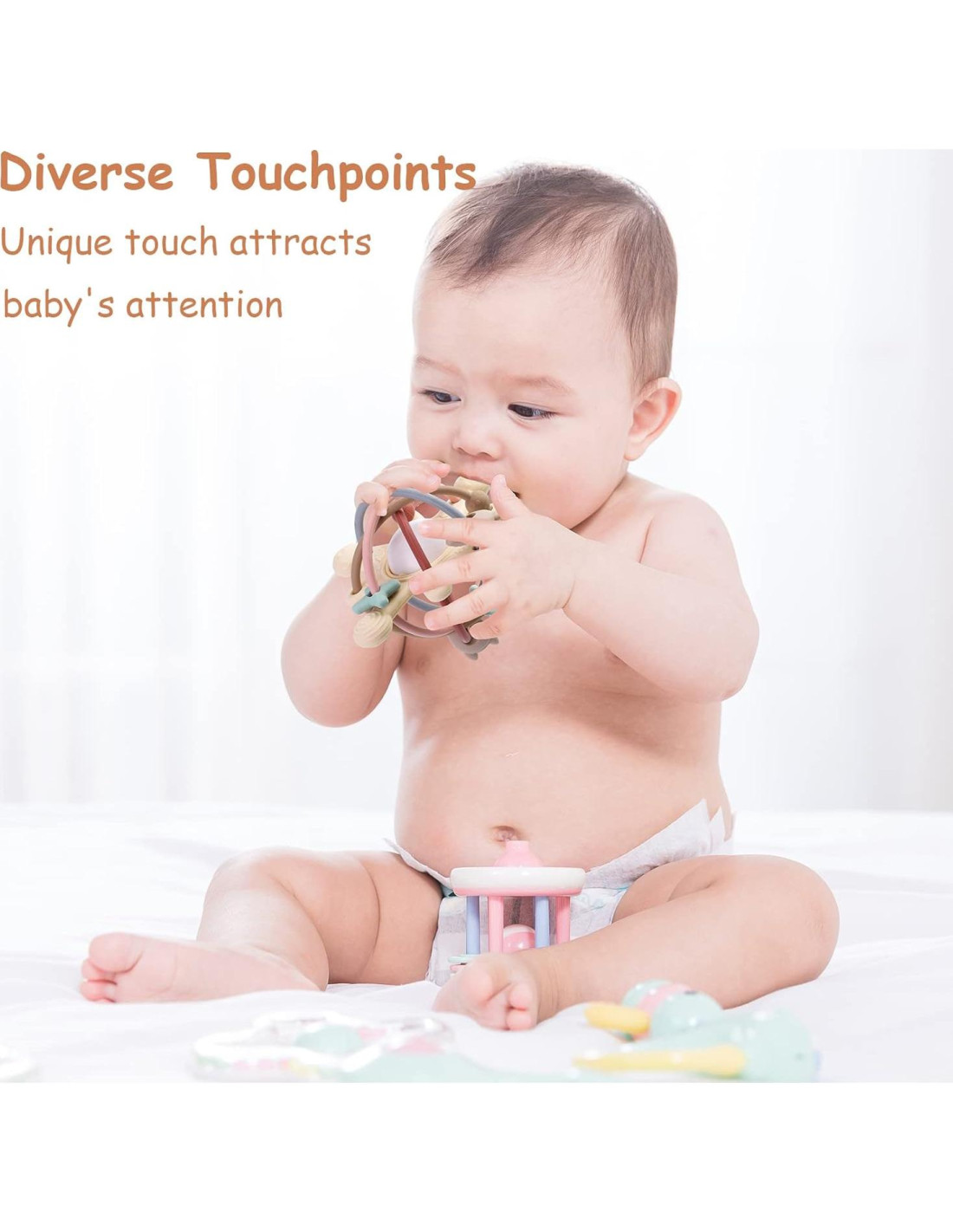 - JUGUETE SENSORIAL PARA BEBÉS: El juguete de dentición de silicona está diseñado para edades de 3 meses en adelante, los colores ricos desarrollan la capacidad de cognición del color. El diseño hueco y el tamaño adecuado ejercitan la capacidad de agarre y la habilidad motora fina. El suave sonido del sonajero proporciona estímulo auditivo y también calma la ansiedad del bebé, un regalo perfecto para baby shower para recién nacidos y nuevas mamás.