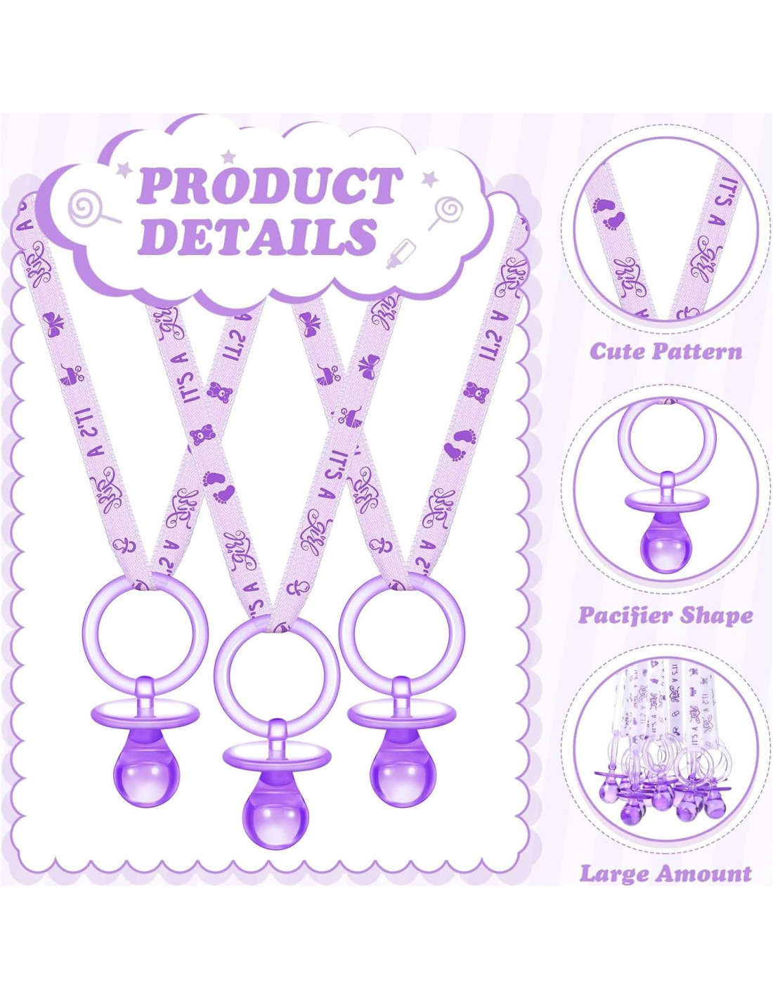 - Material de Calidad: los chupetes para baby shower están hechos de acrílico de calidad; La superficie suave no causa incomodidad a la piel humana, y se pueden aplicar durante mucho tiempo; La longitud del chupete es de 6.35 centímetros (2.5 pulgadas), y el diámetro del anillo es de 3.56 centímetros (1.4 pulgadas); La cinta mide 91.44 centímetros (36 pulgadas) de largo y 1.27 centímetros (0.5 pulgadas) de ancho, delicada y ligera, y se puede llevar fácilmente en tu bolso o bolsillo la mayor parte del tiempo