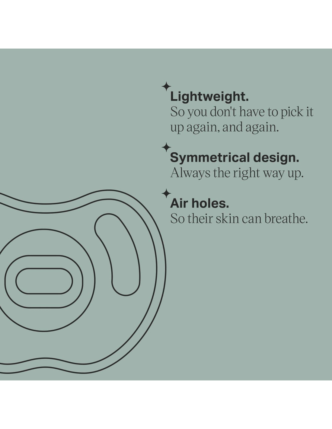 El chupete ligero que se queda en su boca, así que no tienes que recogerlo una y otra vez (y otra vez). - El chupete de silicona de una pieza más ligero* - Tetina de silicona simétrica (así que siempre se coloca del lado correcto) - Agujeros de aire para que su piel pueda respirar - 100% libre de BPA, silicona de grado médico - Disponible en 3 etapas de edad: 0-6, 6-18 y 18-36 meses *Evaluado en ventas minoristas legibles que representan el 98% de la categoría de chupetes en el Reino Unido y el 95% de la categoría de chupetes en EE. UU. (tamaño 0-6m), Nov 2023.