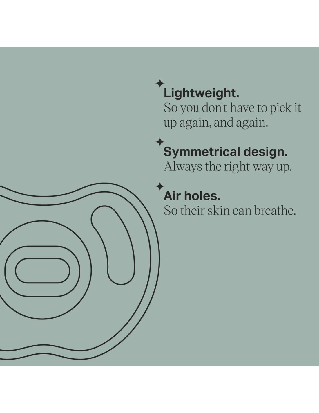 El chupete ligero que se queda en su boca, así que no tienes que recogerlo una y otra vez (y otra vez). - El chupete de silicona de una pieza más ligero* - Tetina de silicona simétrica (así que siempre se coloca de la manera correcta) - Agujeros de aire para que su piel pueda respirar - 100% libre de BPA, silicona de grado médico - Disponible en 3 etapas de edad: 0-6, 6-18 y 18-36 meses *Evaluado en ventas minoristas legibles que representan el 98% de la categoría de chupetes en el Reino Unido y el 95% de la categoría de chupetes en EE. UU. (tamaño 0-6m), Nov 2023.