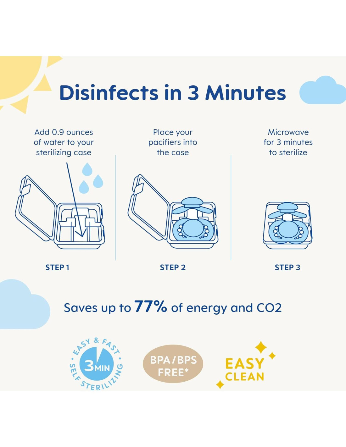 - ESTUCHE AUTOESTERILIZANTE: Agregue agua y colóquelo en el microondas para esterilizar los chupetes de silicona MAM de 6 meses en solo 3 minutos y guárdelos en el estuche para proteger los chupetes en casa y durante los viajes.