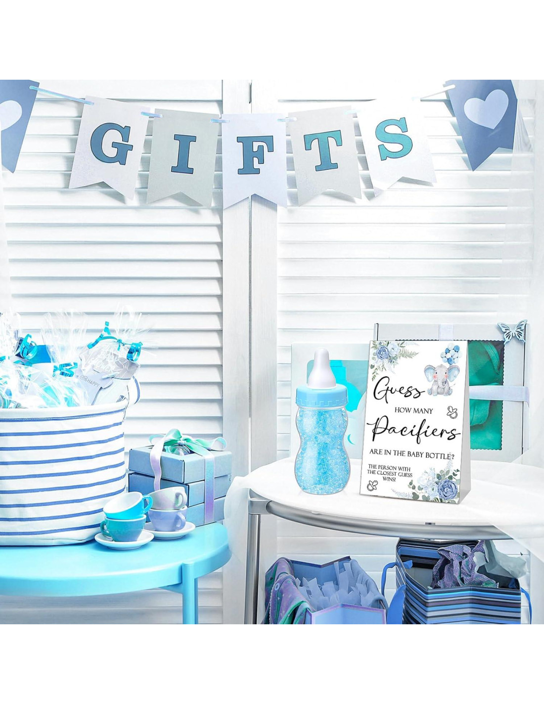 - Incluye paquete: recibirás 1 pieza del cartel Adivina Cuántos Chupetes de elefante, 100 piezas de tarjetas pequeñas, 10 piezas de lápices HB, 1 pieza de botella de leche azul de 750 ml, y 400 piezas de mini chupetes azules, estos juegos de baby shower de elefante pueden satisfacer tus diversas demandas y brindarte una buena experiencia de juego, también son ideales para compartir con otros