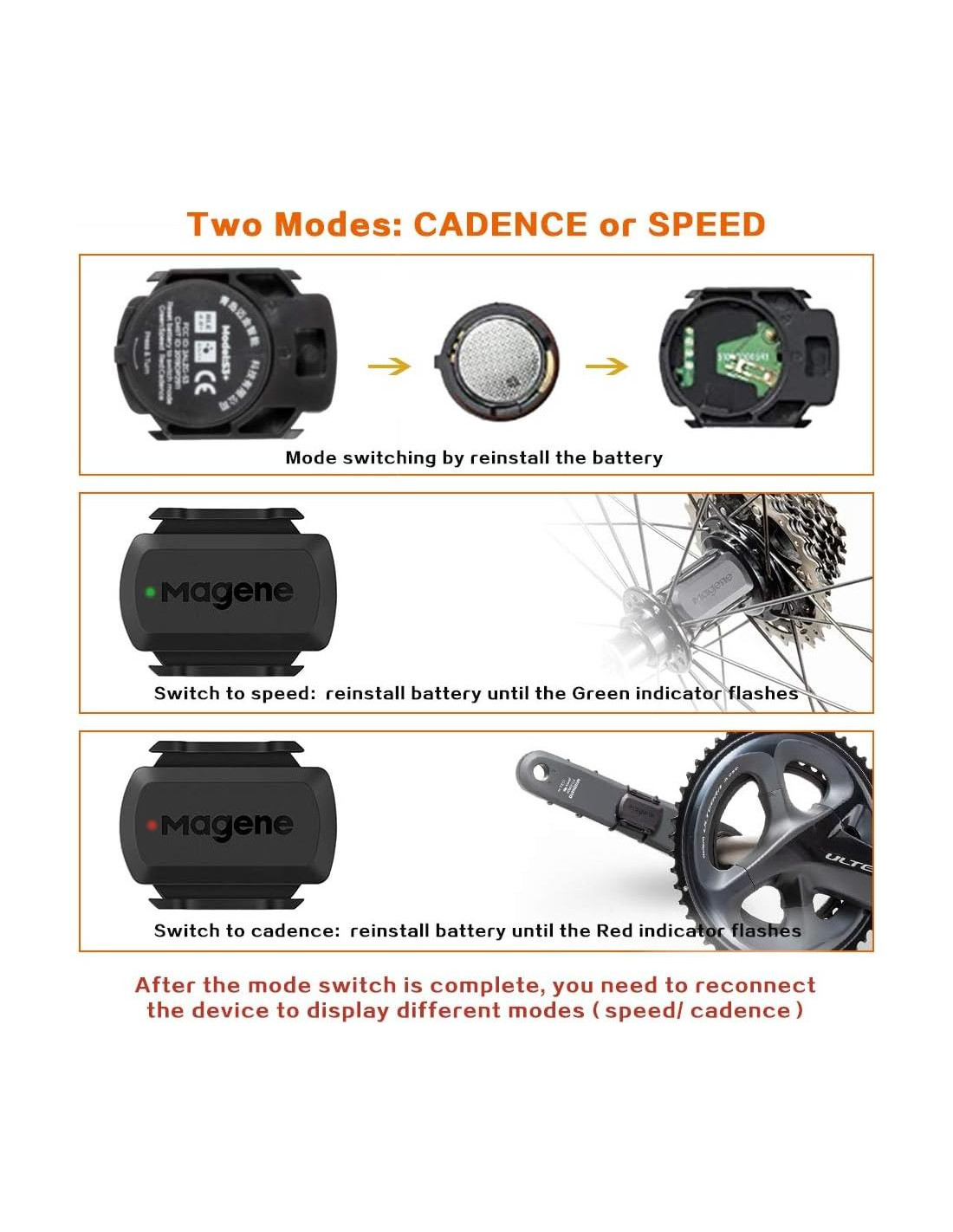 - [Modo] 1 sensor SOLO puede seleccionar un modo (Velocidad o Cadencia) a la vez. Por lo tanto, necesita 2 sensores para probar tanto la velocidad como la cadencia. (1 para velocidad, 1 para cadencia)