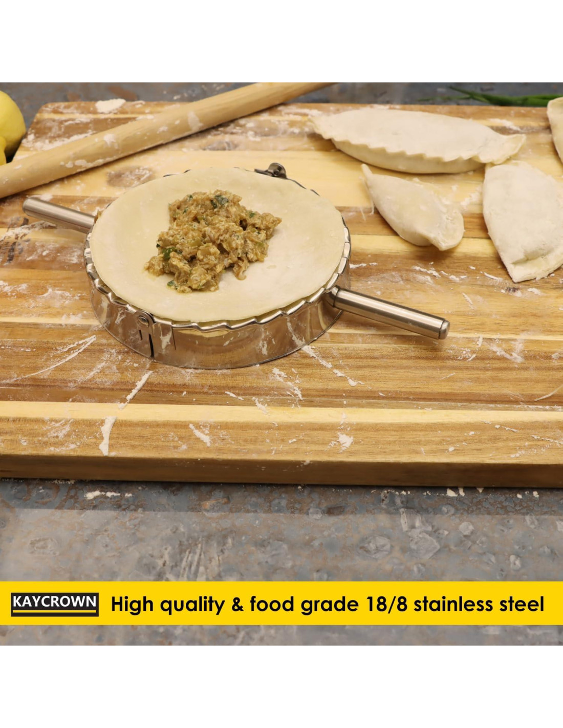 - PRENSA DE EMPANADAS, JUEGO DE RAVIOLI Y DUMPLINGS - Nunca comprometas con nada menos que la perfección cuando se trata de tus utensilios de cocina. Usa masa de pasta fresca y tus rellenos favoritos para crear deliciosas empanadas caseras, dumplings, pierogies, ravioli, empanadas, calzones, mini pasteles, samosas, gyoza y pastelitos con este juego de prensa de empanadas de acero inoxidable. La prensa de empanadas KAYCROWN pertenece a la cocina de cada persona, independientemente de su habilidad culinaria.