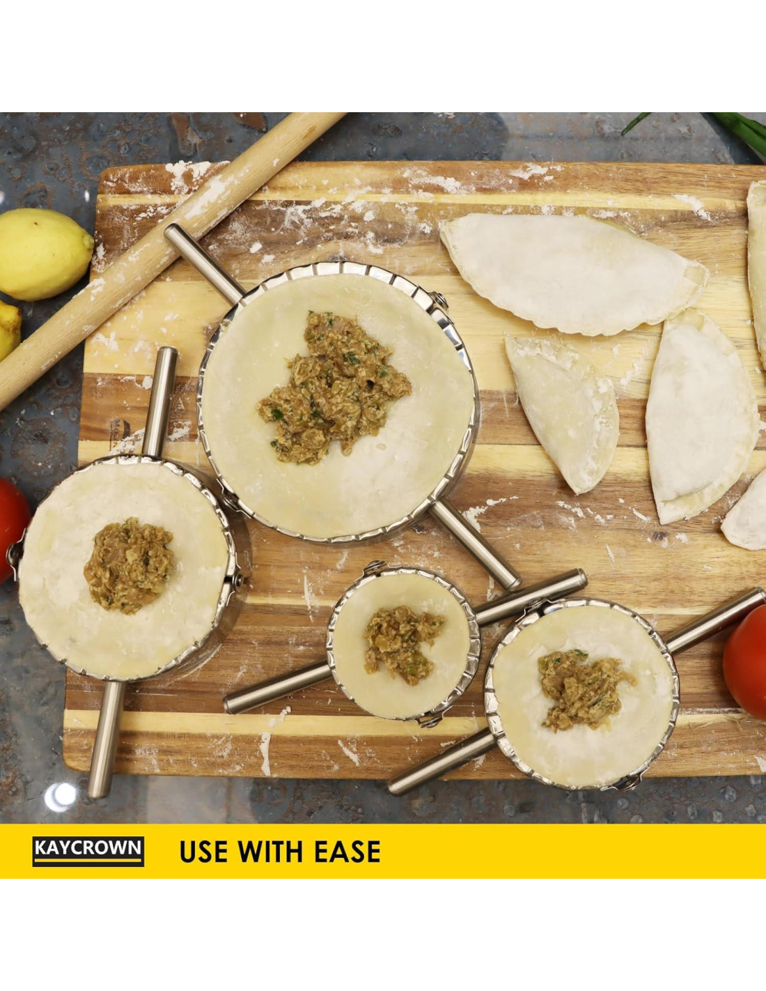 - FÁCIL DE USAR - Los mangos más largos permiten que incluso los dedos torpes mantengan un buen agarre. El borde exterior es lo suficientemente afilado como para cortar fácilmente el volumen necesario de masa, ahorrando tiempo y esfuerzo durante la preparación de las comidas. Simplemente coloca la masa en la parte superior, presiona ligeramente hacia abajo y gira. Luego puedes añadir tus rellenos favoritos y cerrar la prensa de empanadas. Para un cierre seguro, puedes cepillar el borde de la masa con yema de huevo o agua antes de cerrarla.