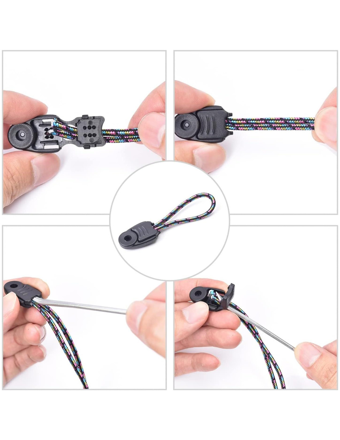 - Uso: puedes quemar el borde del extremo de la cuerda antes de introducirla en el bloqueo de cordón, se sujetará de manera muy segura. Al insertar el cordón, puedes usar un destornillador de hoja plana para desenrollar el cordón, alicates para cerrar y prensar los bloqueos de cordón