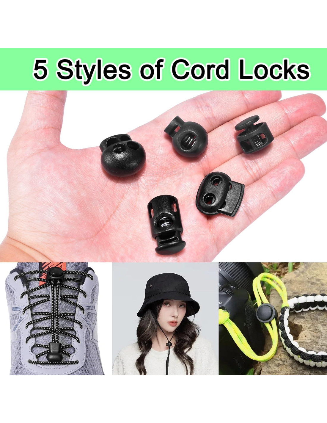 - Multifuncional: Los cierres de cuerda de plástico son adecuados para una variedad de cuerdas y tipos de cuerdas diferentes. Ampliamente utilizados para cordones de zapatos, cuerdas de mochilas, cierres de pantalones, cordones, equipaje, ropa, mochilas, ropa deportiva, pantalones de chándal, sudaderas, gorras, productos de Paracord y una variedad de productos para exteriores y gimnasio