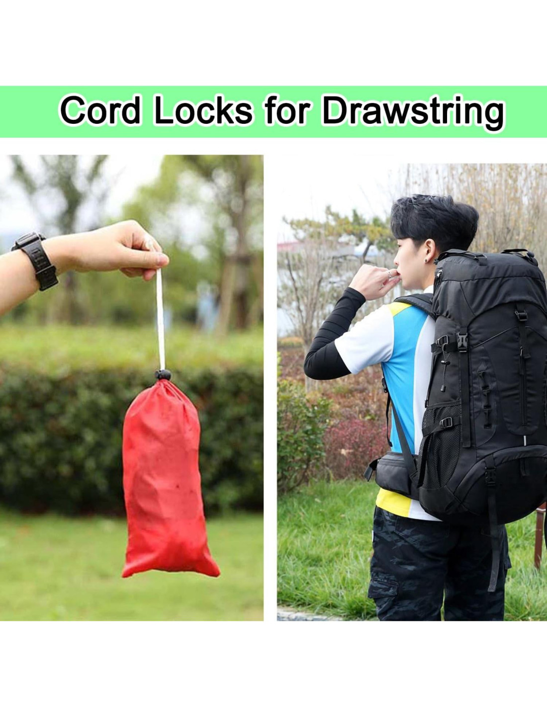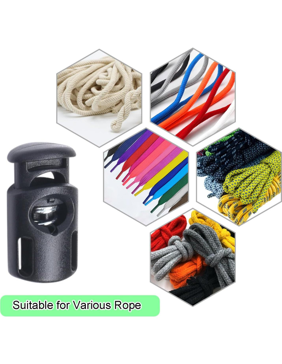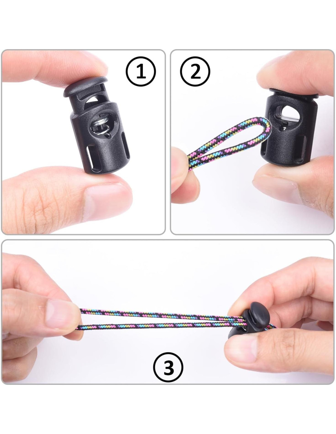 - Fácil de Usar: Presiona la parte superior del cierre de cuerda, coloca la cuerda a través del agujero y ajusta la longitud de la cuerda que necesitas