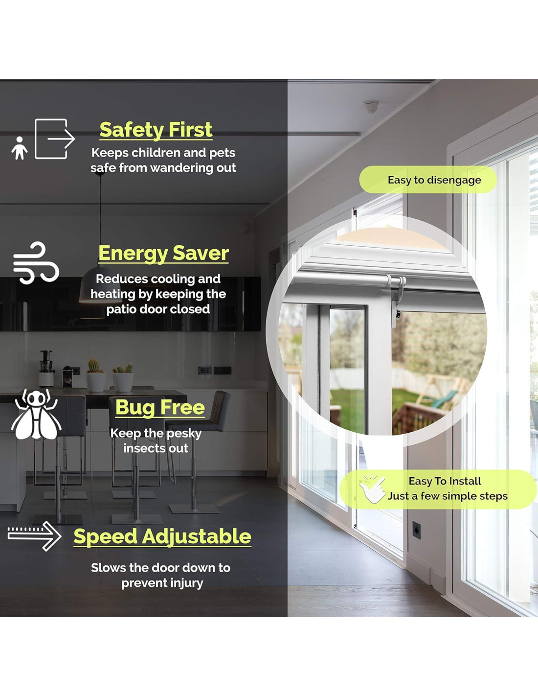 - Velocidad ajustable para ralentizar la puerta como una característica de seguridad infantil para prevenir lesiones.