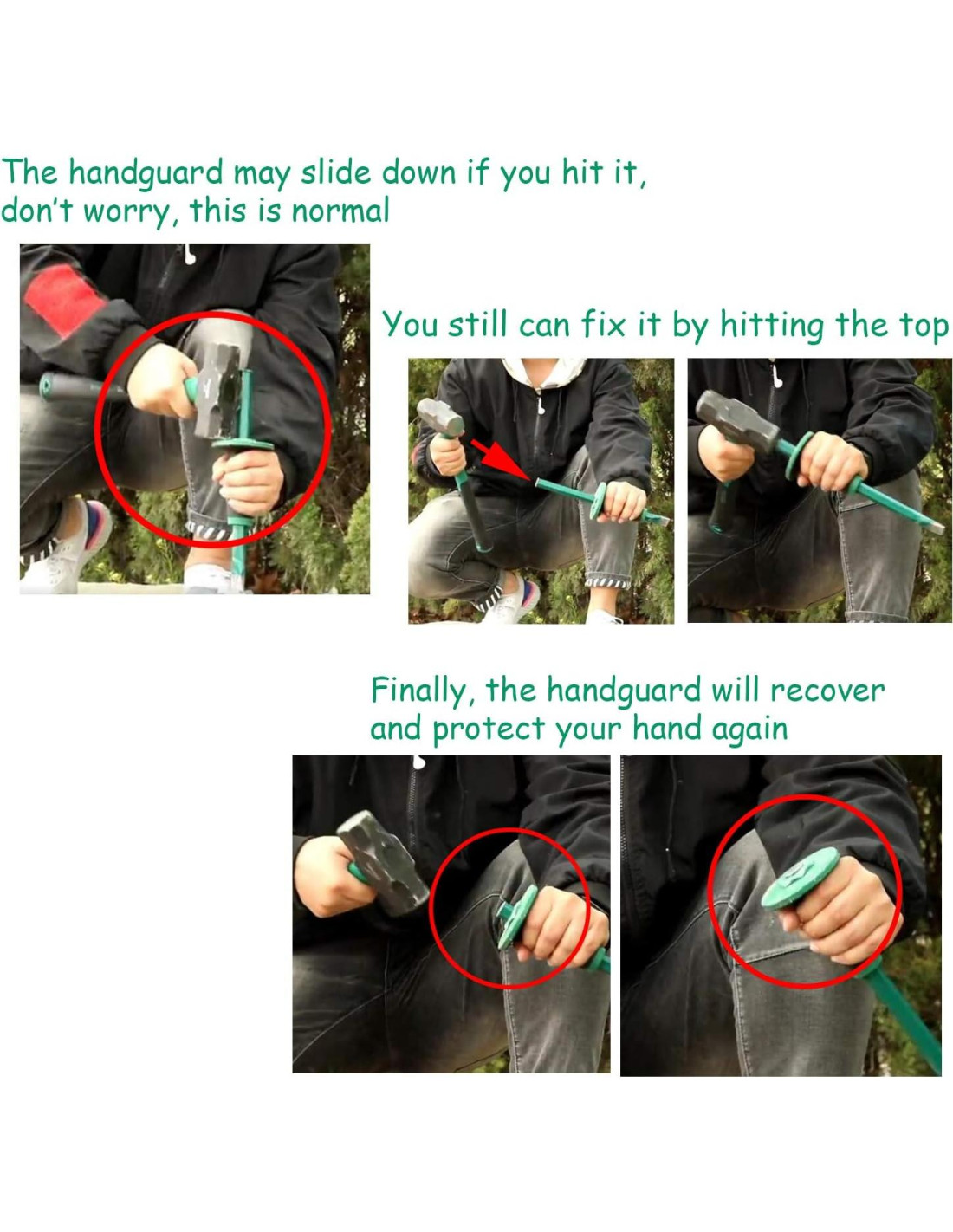 - El mango absorbente de impactos y el protector de mano brindan una gran protección contra golpes excesivos y golpes fallidos, asegurando un corte fácil y preciso