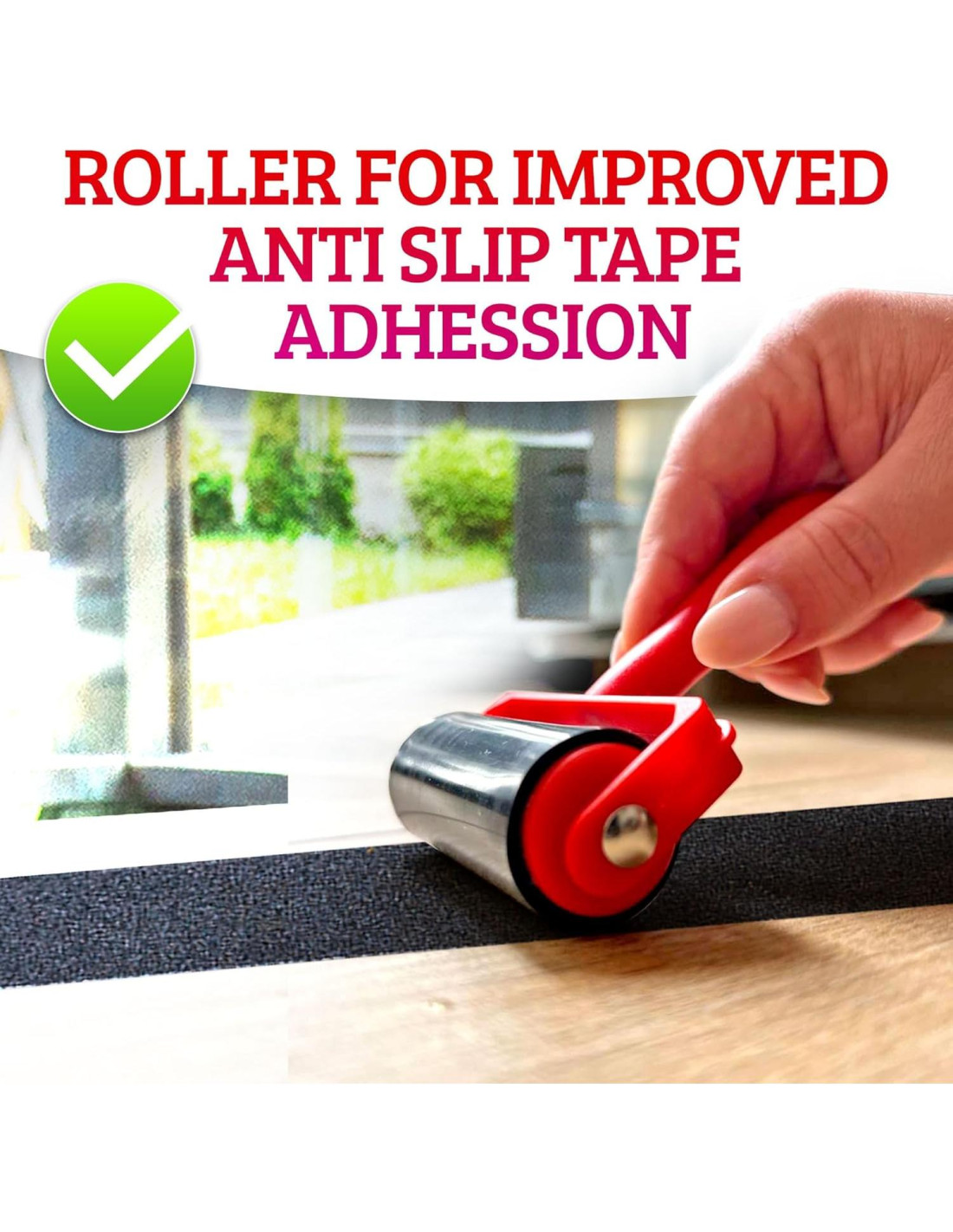 - Indispensable para cualquier Cinta Antideslizante: Simplemente corta un trozo de cinta antideslizante, quita la película protectora, aplica la cinta en una superficie limpia y rueda el aire con el Rodillo de Goma