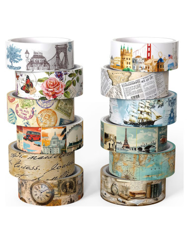 - [Tamaños Perfectos] Conjunto de 12 rollos de cinta washi de la innovadora serie de viajes vintage. Incluyendo 0.59 pulgadas (15mm) de ancho x 12 rollos. Cada rollo de cinta tiene 9.8 pies (3m) de longitud.
