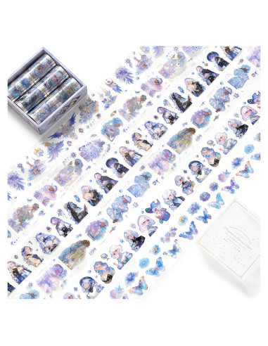- El conjunto de cintas de washi de PET comprende seis rollos de 2.56 pulgadas (65 mm) de ancho y 6.5 pies (2 metros) de largo. La cinta comprende stickers de personajes, flores y mariposas y es adecuada para una variedad de aplicaciones, incluyendo scrapbooking, creación de tarjetas, envoltura de regalos, planificadores y más.