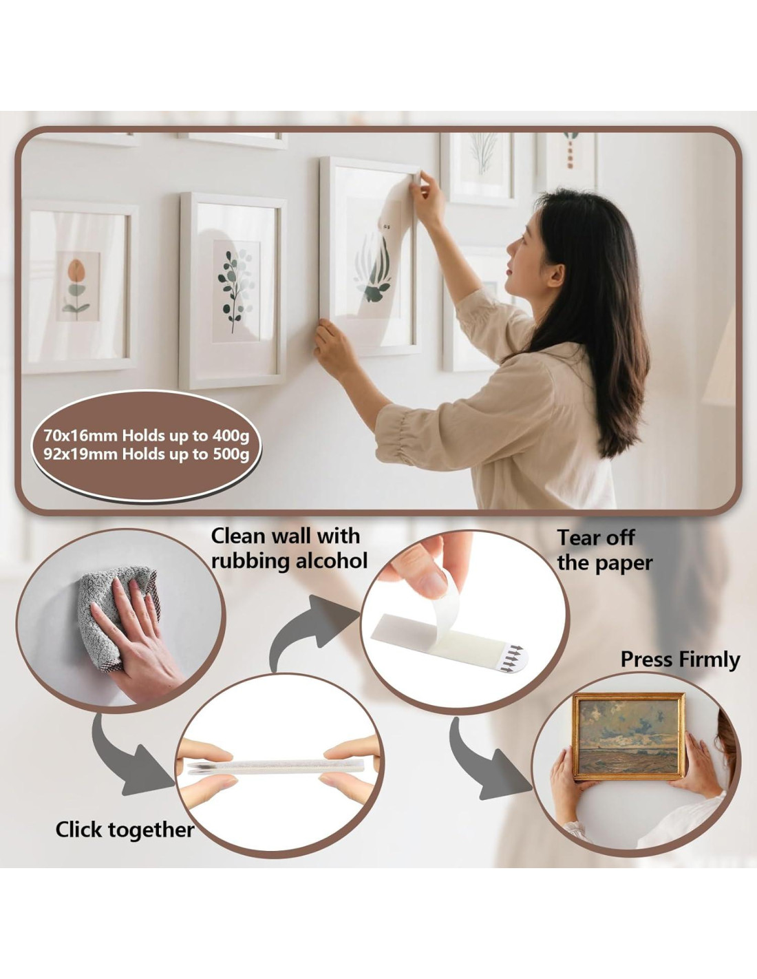 - Instalación Fácil y Sin Herramientas: ¡No se necesitan herramientas, clavos ni martillo! Monta fácilmente marcos de fotos, arte de pared, espejos, relojes, letreros, cubiertas de enchufes y otras decoraciones del hogar exactamente donde lo desees. Estas tiras fáciles de usar son perfectas para residencias estudiantiles, apartamentos, hogares y oficinas - ¡amigables para inquilinos!