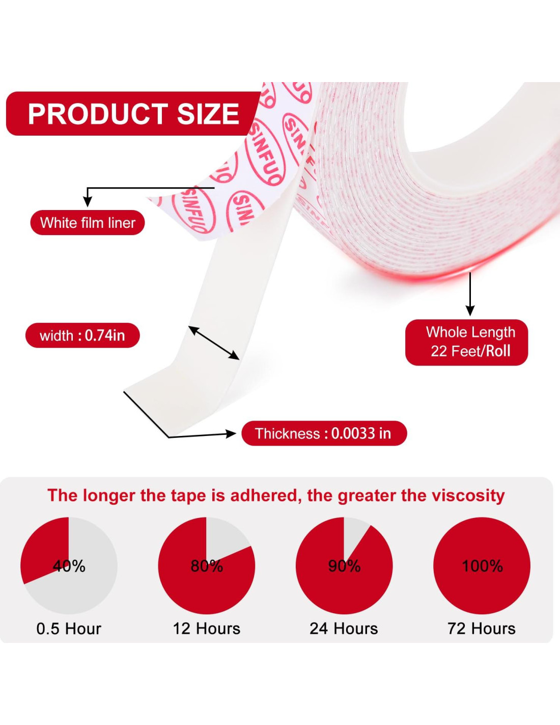 - DATOS DE CINTA DE DOBLE CARA SIN DAÑOS SINFUO: Esta cinta de doble cara removible sin daños es una cinta adhesiva de poliuretano de doble cara sin residuos. Hecha de PE con un ancho de 0.74 pulgadas (19 mm), longitud de 22 pies (6.71 m), grosor de 1.6 mm.