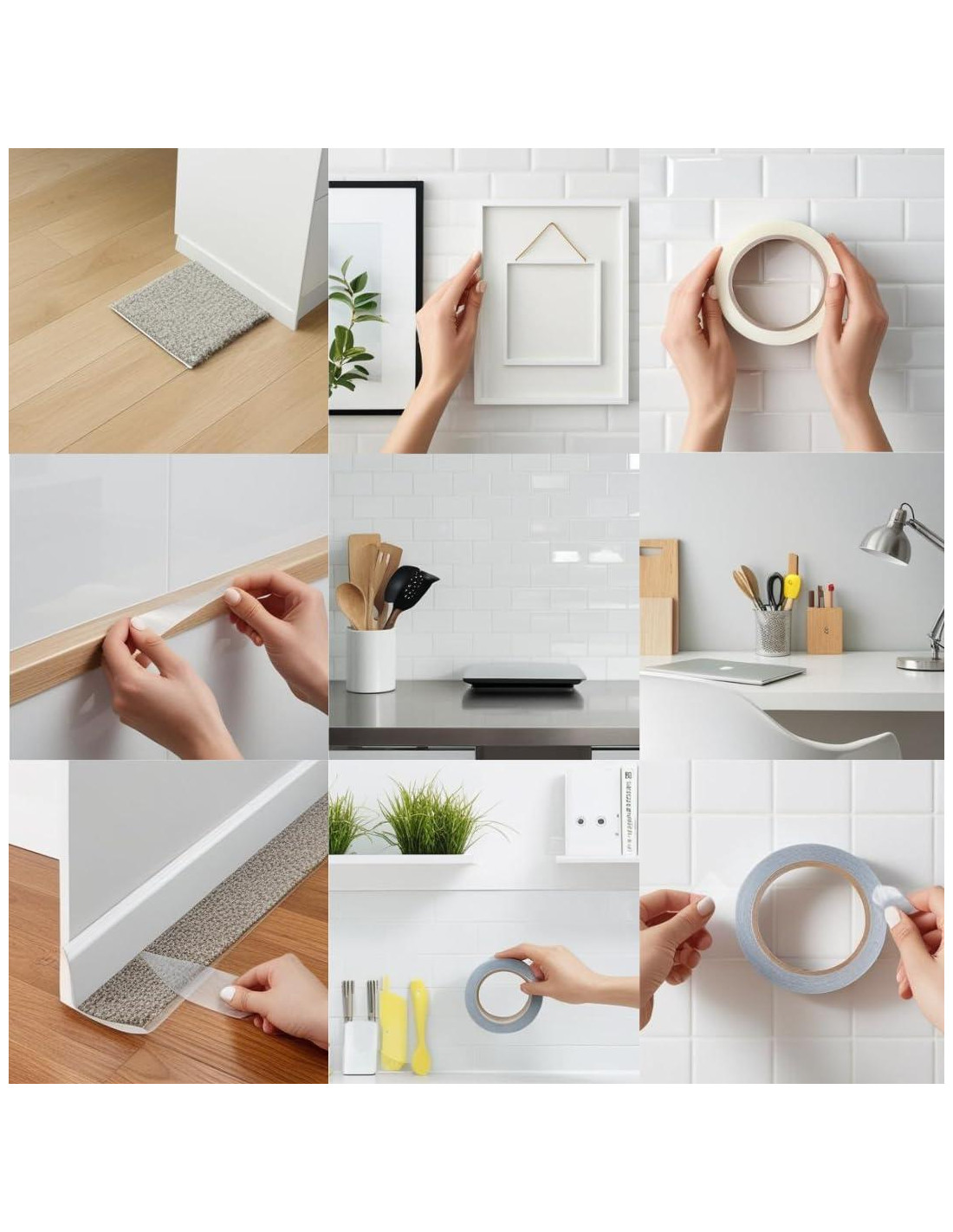 Olvídate de clavos y tornillos proporciona una solución limpia y sin daños para colgar tus marcos de fotos favoritos. Con un fuerte agarre, esta cinta monta de forma segura los marcos en cualquier superficie lisa. La cinta permanece invisible detrás de tu decoración, manteniendo las paredes impecables y ordenadas. ¡Di adiós a los bordes enrollados y las alfombras deslizantes! Esta cinta mantiene tus alfombras y tapetes firmemente en su lugar sin dejar residuos ni dañar los pisos. Ideal para áreas de alto tráfico, nuestra cinta reutilizable y lavable proporciona un agarre que se mantiene firme en las esquinas para una superficie limpia y segura. Mantén tu balanza de cocina estable y sin deslizamientos con esta cinta. Ya sea midiendo ingredientes o controlando tu dieta, esta cinta ofrece un agarre estable que asegura precisión y seguridad. Sin tambaleos ni movimientos, solo un rendimiento confiable en cualquier superficie, incluyendo encimeras resbaladizas. Asegura tu teléfono en el tablero sin montajes voluminosos o desorden pegajoso. Esta cinta proporciona un agarre firme e invisible que mantiene tu teléfono en su lugar para navegación y llamadas manos libres. Reutilizable y lavable, no deja residuos, perfecta para tableros lisos y conducción confiada. Di adiós a clavos, tornillos y pegamento desordenado. Esta cinta es la solución perfecta para necesidades de montaje, organización y aseguramiento en tu hogar, cocina, oficina e incluso en tu automóvil. Diseñada con tecnología avanzada, esta cinta transparente ofrece un agarre fuerte y duradero mientras permanece completamente invisible detrás de los objetos con los que la usas. Ya sea que estés decorando tus paredes o evitando que las cosas se deslicen fuera de lugar, esta cinta hace el trabajo de manera limpia y segura sin dañar tus superficies. Se puede lavar y reutilizar múltiples veces sin perder su poder de sujeción, lo que la convierte en una opción inteligente y ecológica. Perfecta para una amplia gama de usos: funciona mejor en superficies lisas como vidrio, azulejo, metal, plástico, mármol y madera acabada. Se puede cortar a cualquier tamaño o forma, lo que la hace adecuada tanto para artículos grandes como pequeños. Para usar, simplemente corta la cinta a la longitud deseada, quita la película protectora, presiona firmemente sobre la superficie y listo. Cuando sea el momento de quitarla, simplemente pélala suavemente, sin desorden pegajoso ni daños en la superficie. Fuerte. Limpia. Reutilizable. Esta cinta hace que las tareas diarias sean más fáciles y limpias.