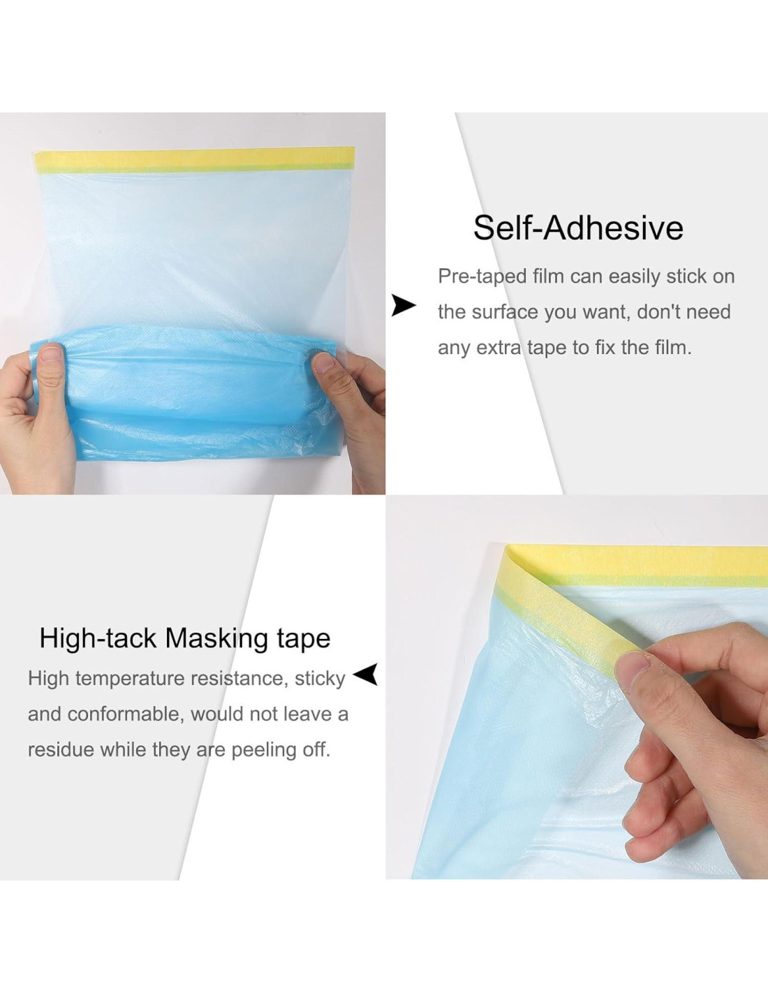Características: Se adhiere fácilmente a las áreas que deseas proteger para mantener el área más limpia durante la decoración del hogar. La película pre-cintada se puede adherir fácilmente a la superficie que deseas, no necesitas cinta extra para fijar la película. Ligera y se adhiere por estática. Cuando la lámina de plástico está cubierta, se puede adherir libremente a la superficie de objetos como muebles y paredes para asegurar una protección completa. Película de PE (polietileno) de alta densidad, grosor moderado y buena resistencia, no es fácil de rasgar. Disponible en varios anchos y longitudes para áreas pequeñas y grandes como zócalos, gabinetes, ventanas, alfombras, tapetes, pisos, paredes, electrodomésticos y muebles. Especificación: Material: PE (Polietileno) Aplicación: Interior Ancho de Cinta: 15mm / 0.59 pulgadas Total Tamaño (desplegado): 1.5m x 20m / 4.9 pies x 65.6 pies (Ancho*Largo) Contenido del Paquete: 4 Rollos x Película de Enmascarar Pre-Cinta
