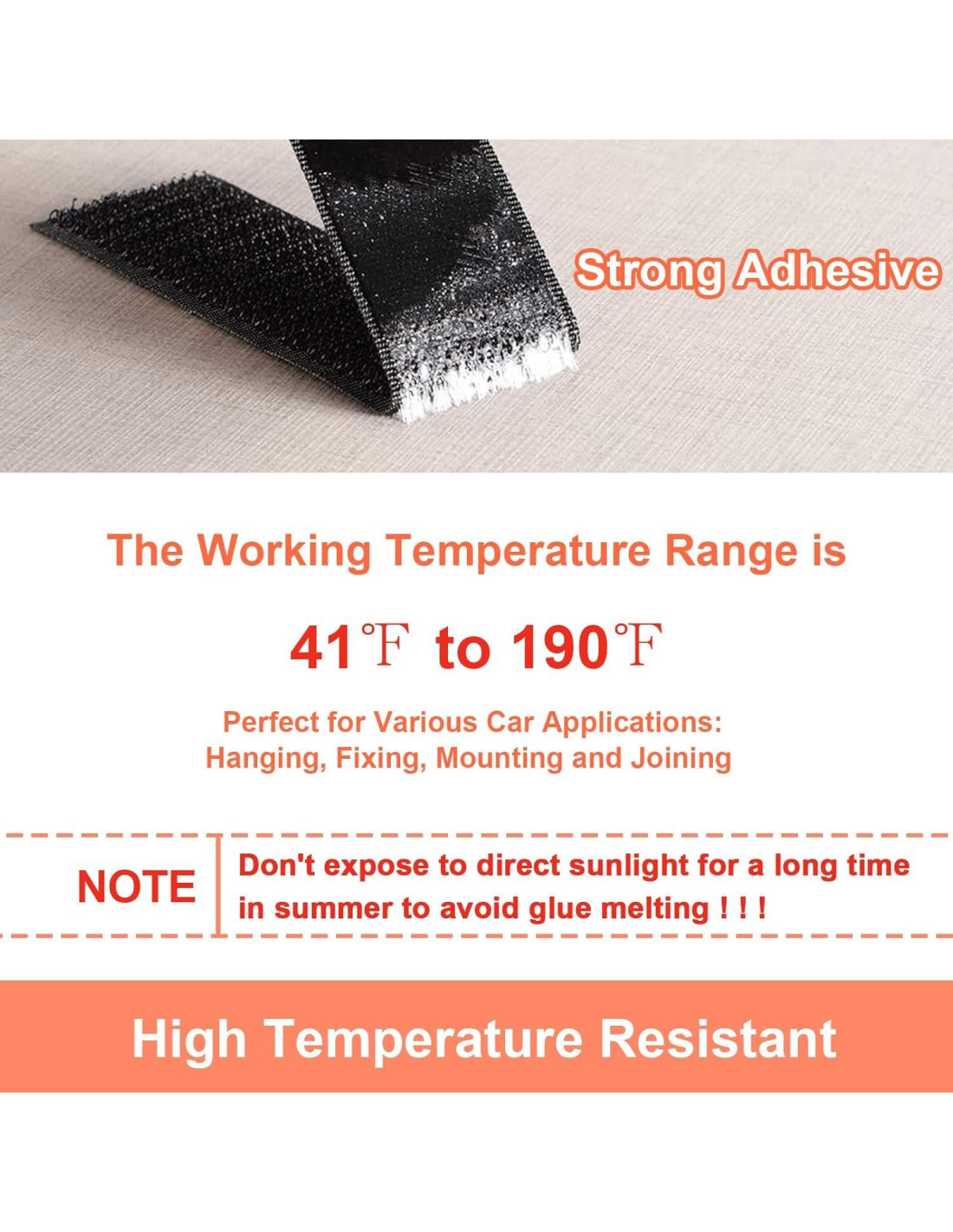 - Excelente Resistencia a la Temperatura: Diseñada para diversas aplicaciones en autos y RV, estas cintas de gancho y bucle adoptan un respaldo adhesivo de primera calidad, que puede funcionar en un rango de temperatura de 5C a 88C. No es fácil de derretir a medida que la temperatura aumenta y hace un desastre en tu auto
