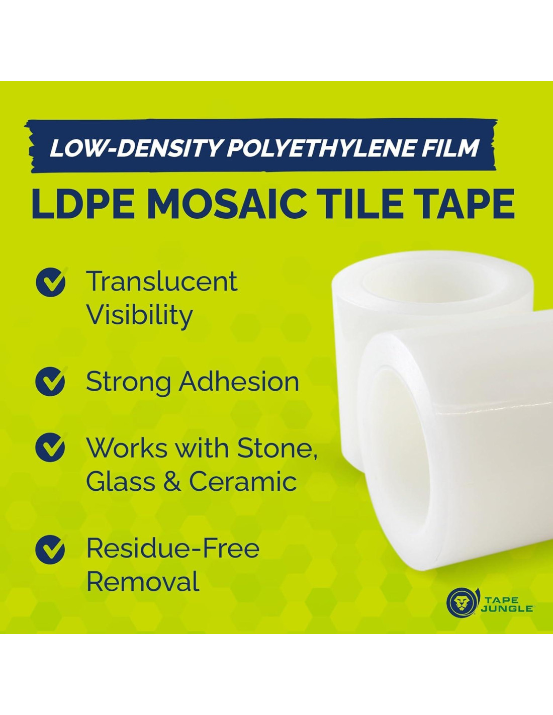 Película de Polietileno de Baja Densidad (LDPE) para Azulejos de Mosaico. Cinta adhesiva transparente montada en la parte frontal; lo suficientemente fuerte como para sostener azulejos durante el transporte y la instalación. Diseñada para liberarse después de la instalación sin dejar residuos adhesivos en sus azulejos. Se puede usar con piedra, vidrio y cerámica. Simplemente deséchelo del rollo y aplique. Sin papel de liberación autolevelante: elimina los diferentes niveles en la superficie creados por piezas de piedra y azulejos con diferentes grosores. Totalmente transparente para que pueda ver su diseño de azulejos durante la instalación. Cinta de película de polietileno de baja densidad. Adhesivo acrílico. Altamente conformable. Buena resistencia a la abrasión y a productos químicos. Propiedades excepcionales de barrera contra la humedad. El sistema de adhesivo sensible a la presión a base de acrílico proporciona alta adhesión y cohesión, lo que genera un vínculo permanente con prácticamente ninguna fuga en los bordes. Resistente a los rayos UV. Excelente estabilidad a largo plazo sin amarillamiento. No se agrieta ni se pliega a bajas temperaturas. Núcleo de plástico de 3 pulgadas (7.62 cm). Aplicación: Envoltura de tubería de purificación de filtros de agua, sellado protector, empalmes, costuras y parches donde se requiere un material altamente conformable y ópticamente claro. Propiedades Físicas: Grosor Total: 5.5 mil (0.14 mm) Resistencia a la tracción 11 lbs/in. de ancho Adhesivo: Acrílico Elongación (en ruptura): 400% Adhesión al acero: 56 oz/in. Rango de temperatura de operación: 50 F (10 C) a +120 F (49 C)