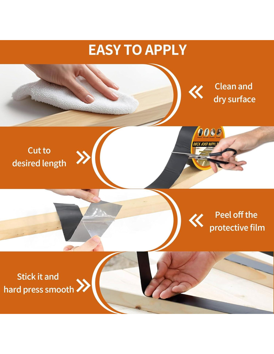 - Cinta para Vigas de Deck de Alta Calidad: la cinta adhesiva de butilo impermeable para vigas de deck crea un sello hermético para bloquear el agua, protegiendo las uniones de madera y metal de daños estructurales, para prolongar la vida útil del deck de madera, que es perfecta para uso en interiores o exteriores.