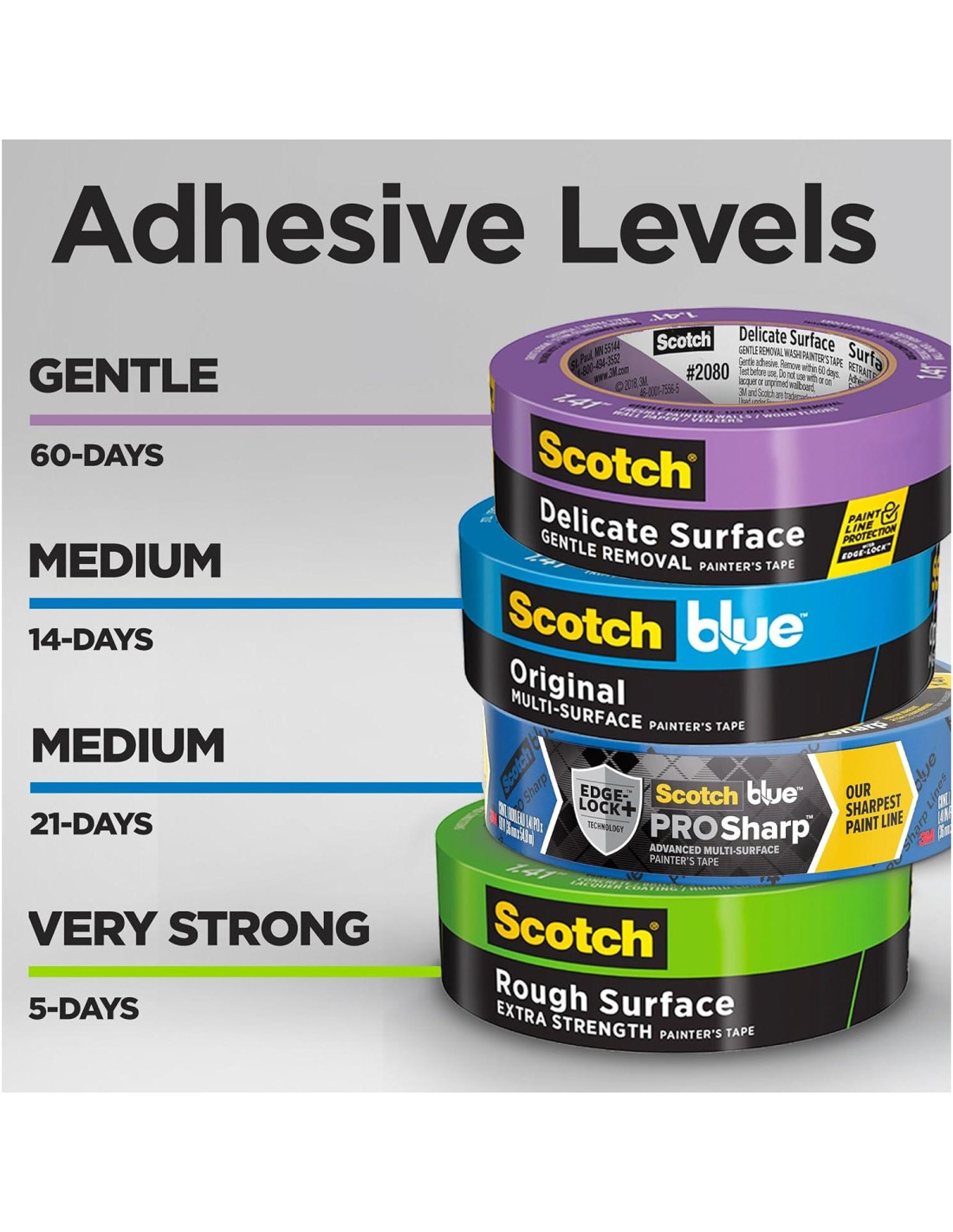- PROTEGE SUPERFICIES DELICADAS: Cinta de enmascarar especialmente diseñada para superficies delicadas, como pisos de madera, papel tapiz, gabinetes, paneles de yeso pintados y paredes de acento recién pintadas (pintadas hace al menos 24 horas)