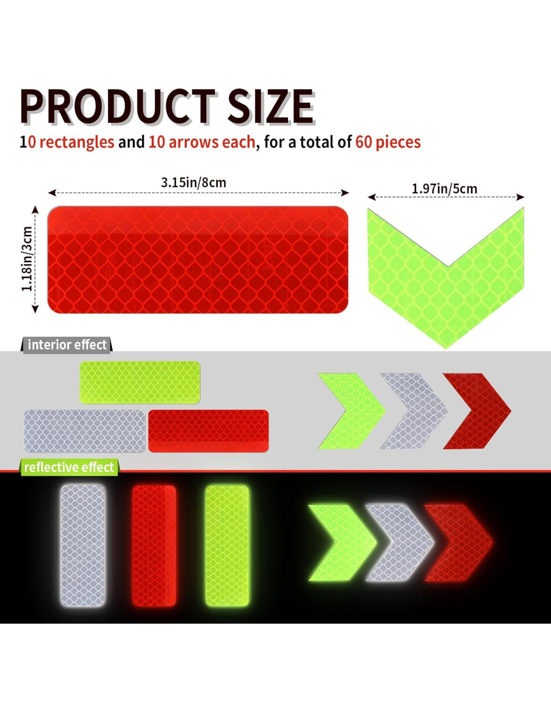 - ESPECIFICACIONES: El juego de cinta reflectante nocturna contiene dos especificaciones, el tamaño rectangular es de 3x8 cm y el tamaño en forma de flecha es de 5 cm. Hay 3 colores de pegatinas reflectantes: amarillo, plateado y rojo para elegir. 20 imágenes de cada color, 60 imágenes en total.