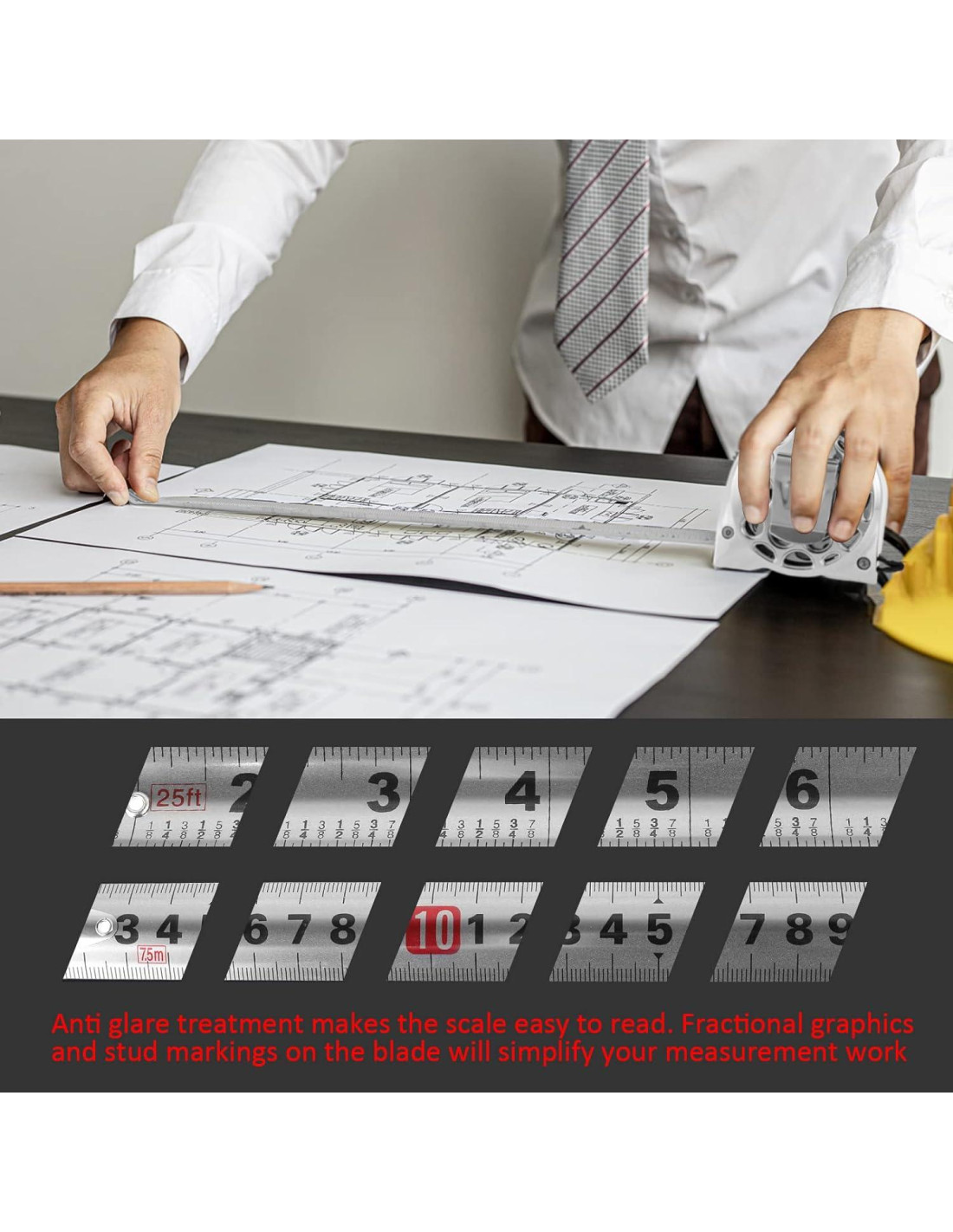 - Cinta Retráctil de 7.5m/25FT: La longitud de la cinta retráctil es de 7.5m/25ft, con un ancho de cinta de 2.5cm/0.98in. La cinta tiene marcas claras en ambos lados, con medidas imperiales (FT) en el frente y medidas métricas (cm) en la parte posterior, satisfaciendo casi todas las necesidades de medición.