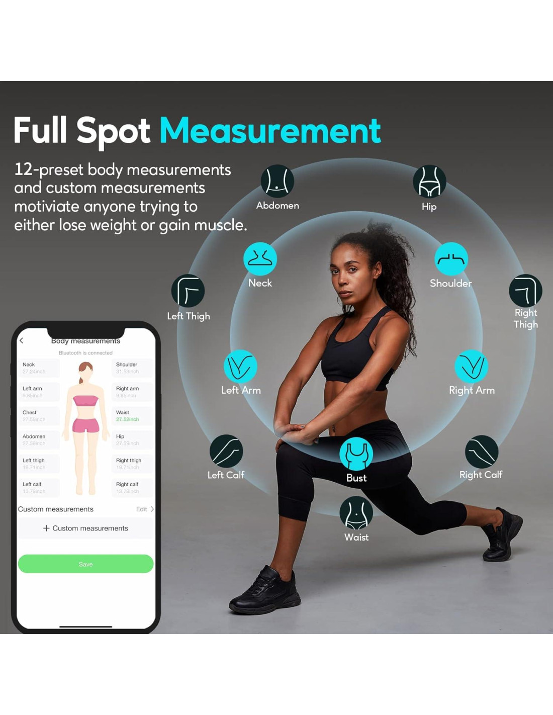 - Mediciones corporales completas: 12 circunferencias preestablecidas que puedes registrar y también puedes agregar las tuyas personalizadas. Las lecturas se pueden leer desde la pantalla digital de la cinta métrica corporal o en la aplicación. Una gran herramienta y motivador para cualquiera que esté tratando de perder peso o ganar músculo. Gran manera de rastrear tu progreso y asegurarte de que te mantienes en el camino.