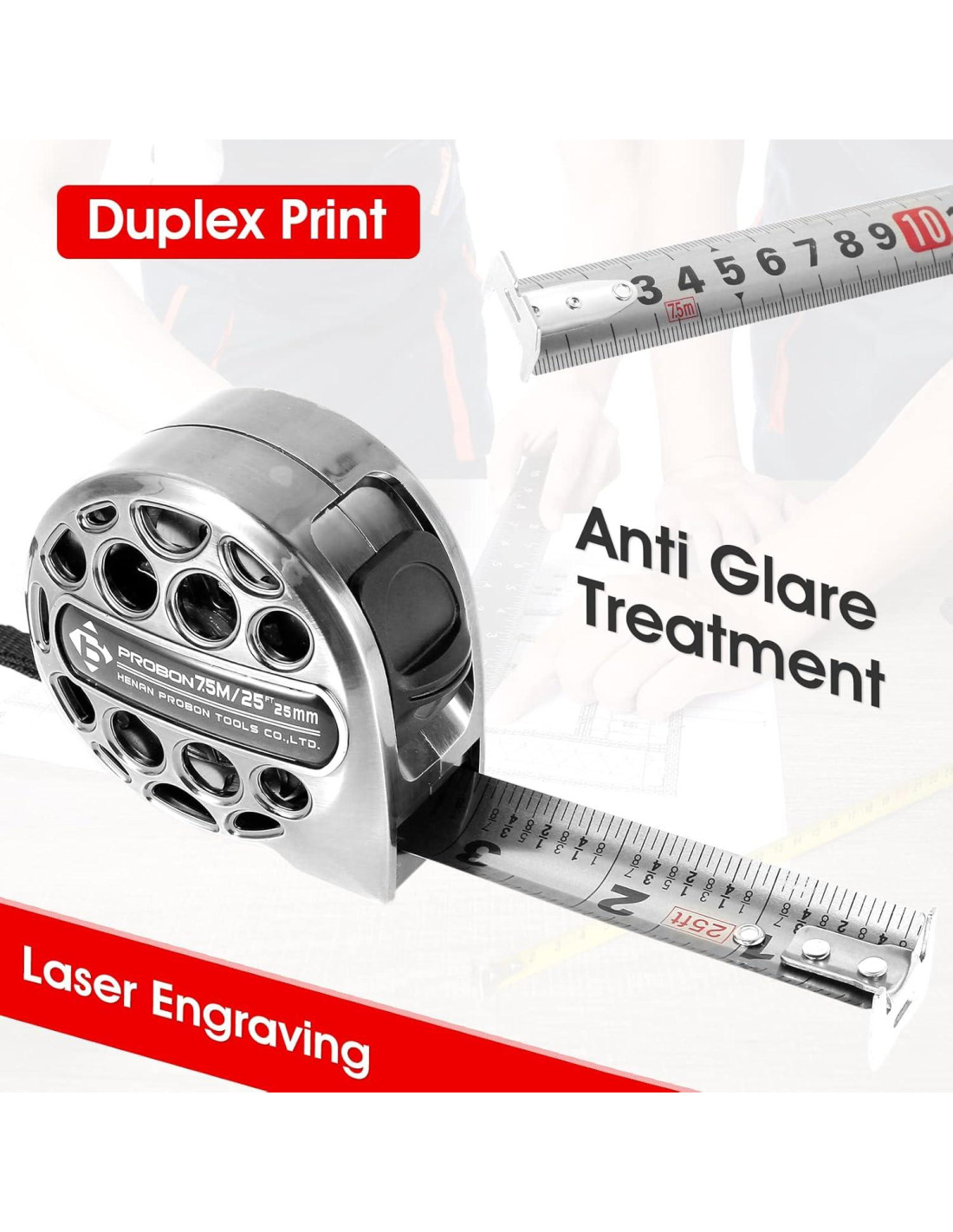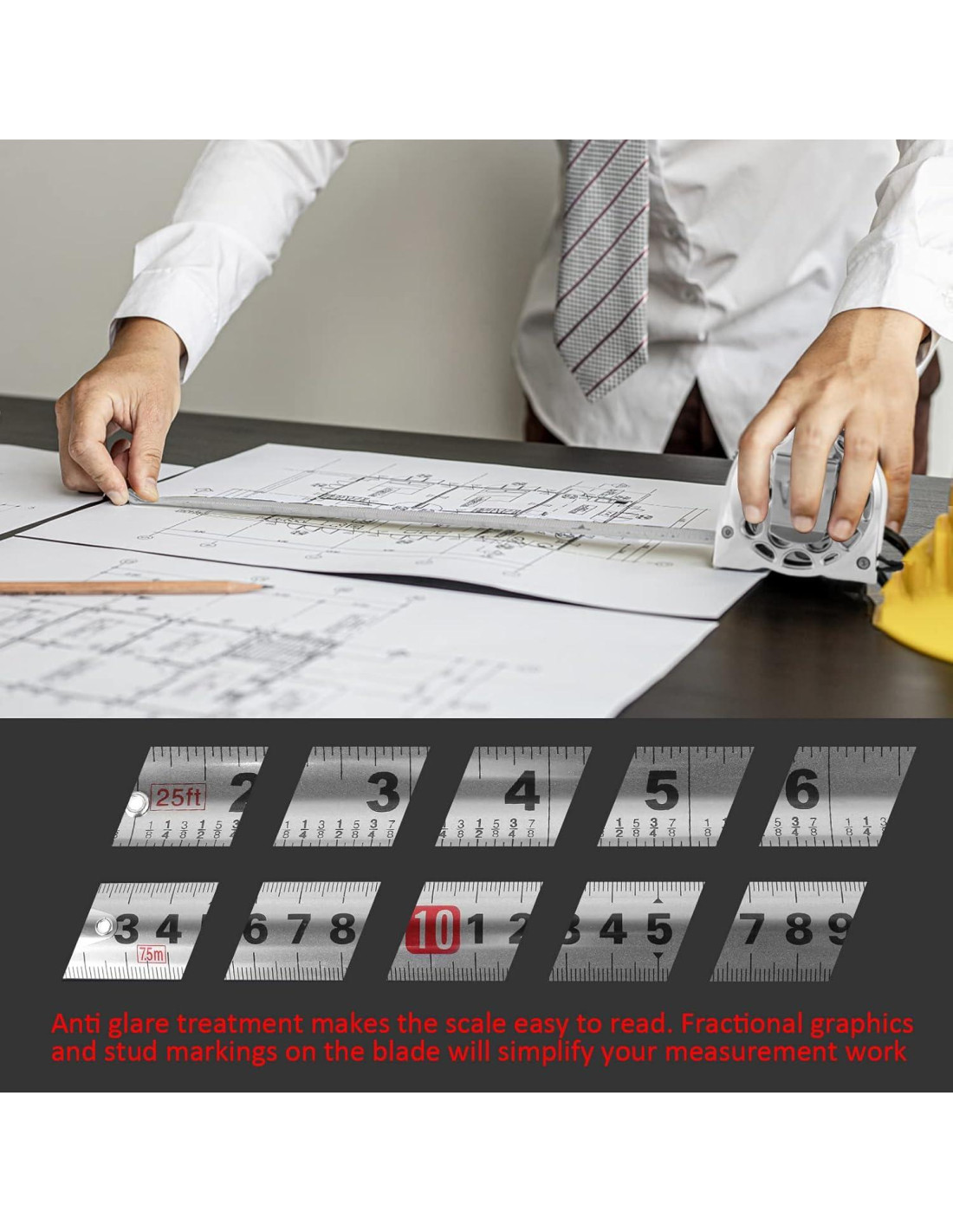 - [Cinta Retráctil de 25FT] La longitud máxima de medición de la regla de medida retráctil es de 7.5m/25ft, lo suficientemente larga para satisfacer casi todas las necesidades de medición. Puedes tirar de la cinta a la longitud adecuada según tu proyecto de medición, y también es fácil de retraer de nuevo en la carcasa.