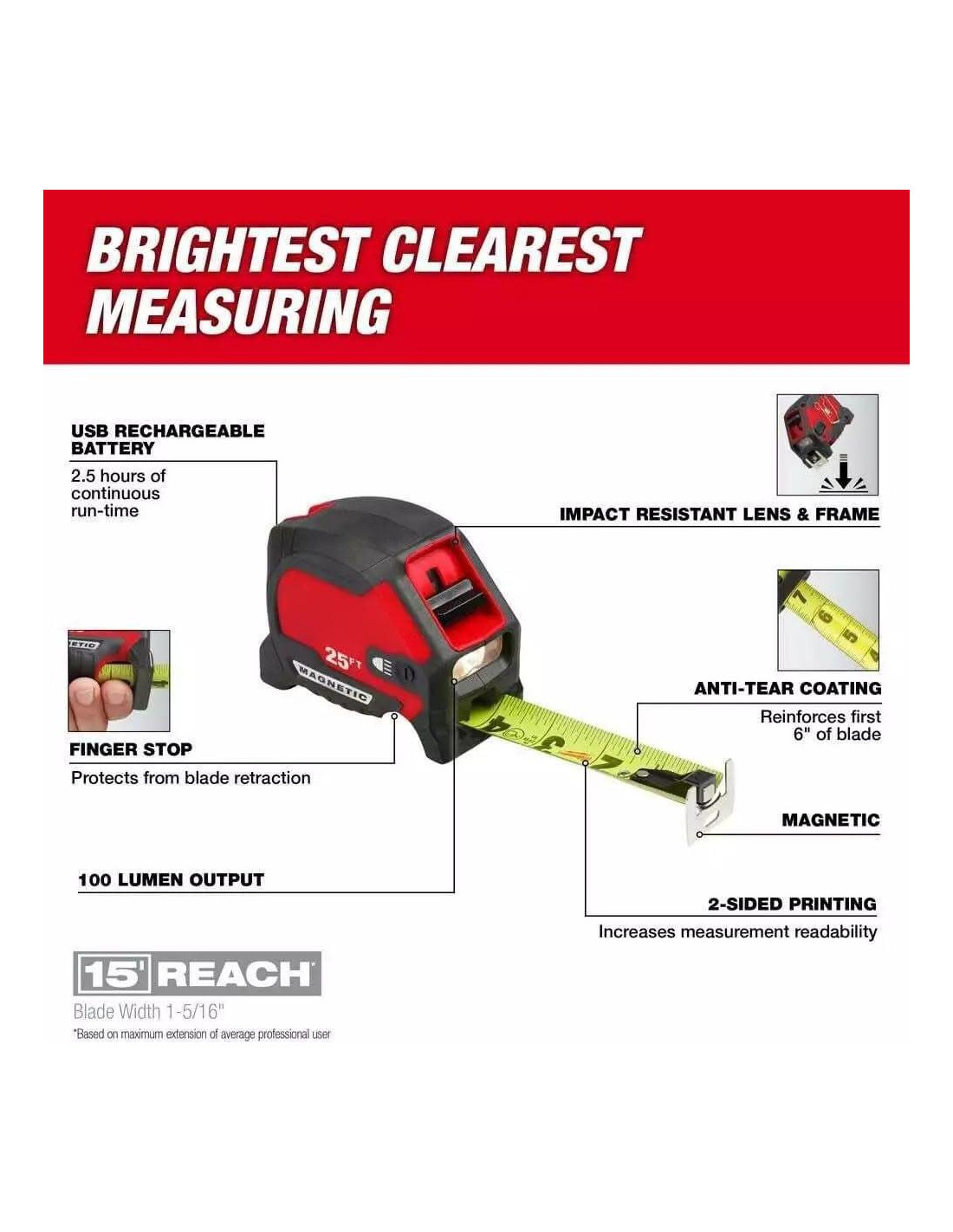- Iluminación Impresionante: La Cinta Métrica Magnética de 25 pies (7.62 metros) viene con una luz recargable de 100L. El LED proporciona una iluminación brillante y clara para sitios de trabajo oscuros.