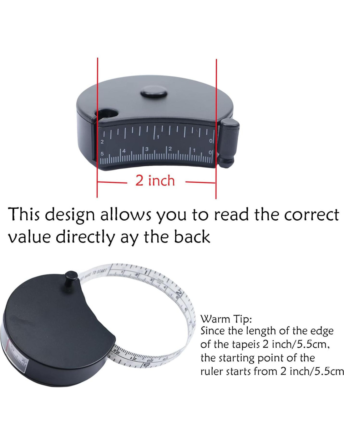 Características: Material Duradero: Cinta de fibra de vidrio suave y avanzada, evita lesiones o cortes. Es duradera y no se borra fácilmente. Cinta Métrica Corporal: 60 pulgadas (152.4 cm) de longitud. Cinta Métrica Retráctil Flexible y Precisa: La cinta métrica corporal cuenta con un bloqueo de pin y un botón de presión, solo envuélvela alrededor de tu cuerpo y podrás leer el valor correcto por ti mismo. Especificaciones: Material: Plástico Color: Negro, Rosa, Blanco