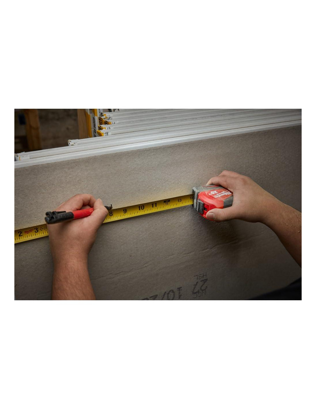 - Un clip de cinturón de acero estampado incorporado te permite llevar fácilmente la cinta métrica contigo alrededor del sitio de trabajo.