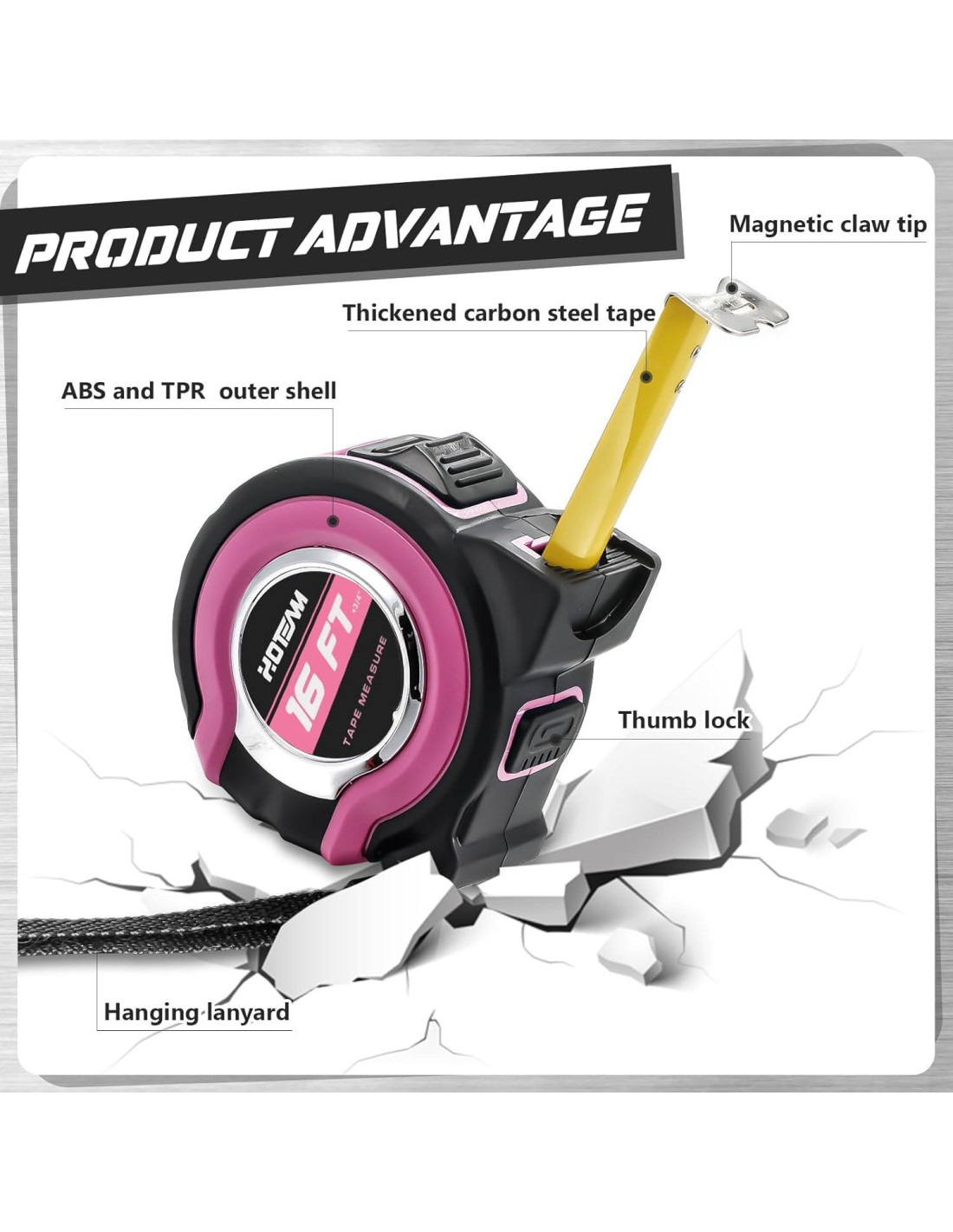 - Diseñado con Calidad: experimenta una funcionalidad prolongada con la cinta métrica de 16 pies (4.88 metros); Su carcasa está hecha de ABS y TPR y es encantadora con un recubrimiento de nylon rosa; Además, la cinta métrica con fracciones incorpora una cinta de regla de acero, firme y flexible, resistente a arrugas, óxido, roturas o desvanecimiento para servirte eficazmente