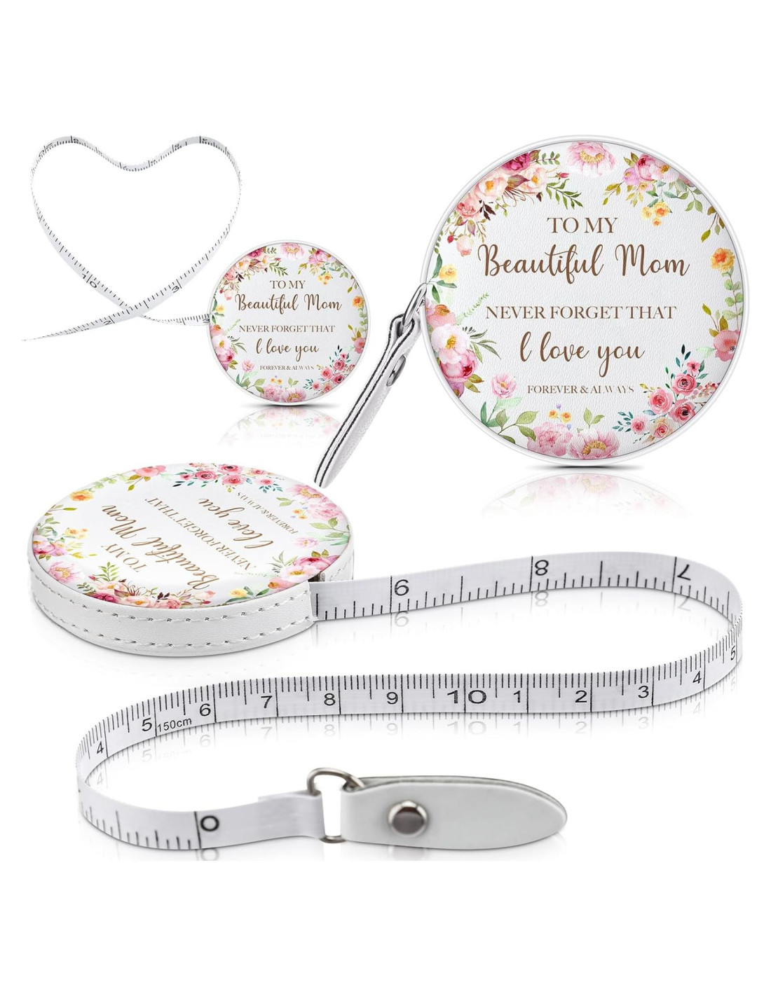 Características: Cada juego de cintas métricas está bellamente empaquetado y se puede colocar en una bolsa de regalo, por lo que se puede dar como regalo sin empaque adicional. Usa un regalo para mostrar tu consideración y cuidado por tu madre y hacer que la ocasión memorable sea significativa. Especificaciones: Material de la cinta métrica: cuero PU, fibra de vidrio Color principal: Cinta métrica: blanca (interna), blanca y rosa (externa) Bolsas de organza: blancas Tamaño: Cinta métrica plegada: aproximadamente 5.5 x 5.5 cm (2.17 x 2.17 pulgadas) Cinta métrica desplegada: aproximadamente 1.5 m (60 pulgadas) Bolsas de organza: aproximadamente 10 x 12 cm (3.94 x 4.72 pulgadas) El paquete incluye: 2 x Cinta métrica 2 x Bolsas de organza Notas: Medición manual, por favor permite ligeros errores en el tamaño. El color puede tener una ligera diferencia debido a diferentes pantallas. Puede existir riesgo de enredos, por favor mantén nuestro producto alejado de los niños.