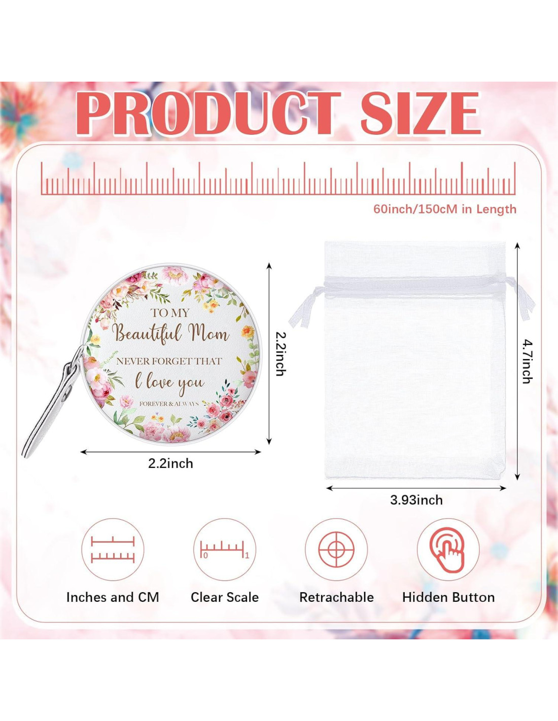 - Combinación de Paquete: incluye 2 cintas métricas rosas impresas y 2 bolsas de organza blancas, se puede dar como regalo sin otro empaque; No es solo una cinta métrica, sino un regalo considerado de un niño a su amada madre