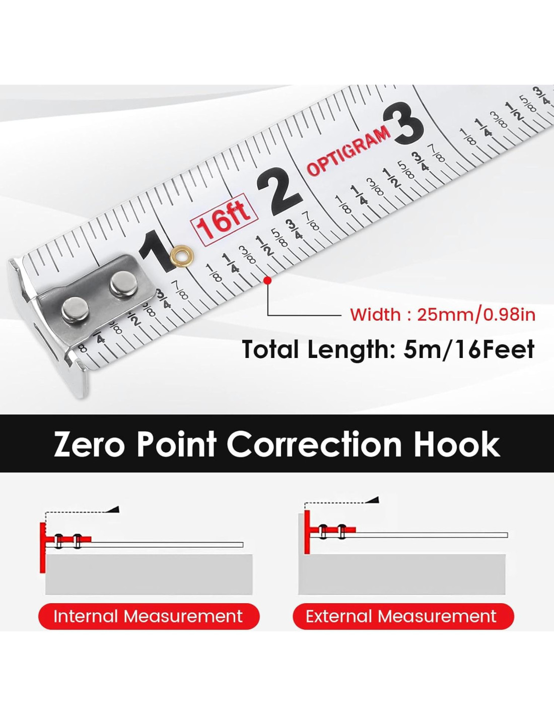 - [Cinta Retráctil de 16FT] La longitud máxima de medición de la regla de medida retráctil es de 5m/16ft, lo suficientemente larga para satisfacer casi todas las necesidades de medición. Puedes tirar de la cinta a la longitud adecuada según tu proyecto de medición, y también es fácil de encoger de nuevo en la carcasa.
