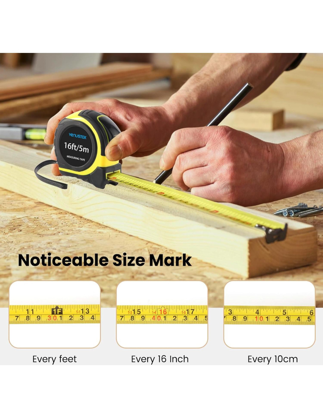 - [Cinta Métrica 10M/32 FT] Con cuchilla de acero engrosada, esta cinta métrica se mantiene recta hasta 32ft (10M) para medir distancias largas sin esfuerzo.