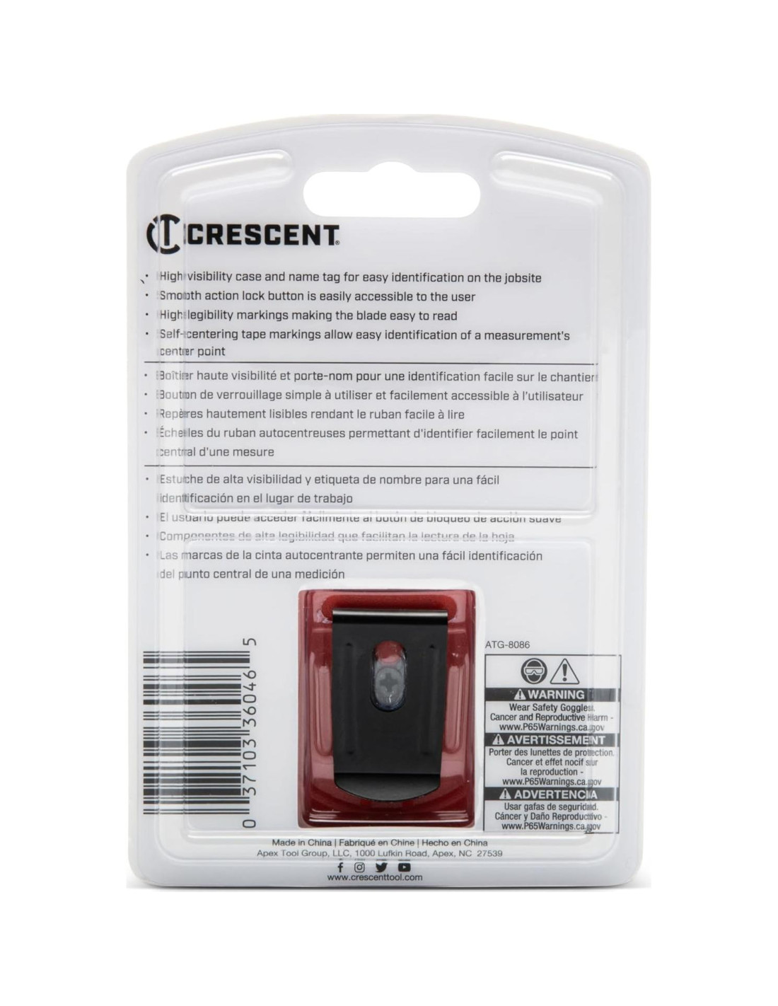 La Cinta Métrica L600 de Crescent es la cinta de trabajo que debes tener. Su caja duradera y altamente visible y el espacio para el nombre asegurarán que nunca pierdas el rastro de tu cinta favorita. Su botón de bloqueo de acción suave hace que usarla sea muy fácil. La Cinta Métrica L600 tiene impresión grande y marcas en negrita que aseguran precisión en cada uso. Esta cinta fue hecha para trabajos en solitario con una ranura para clavos para mediciones largas y un agujero para sujetarla y evitar caídas.