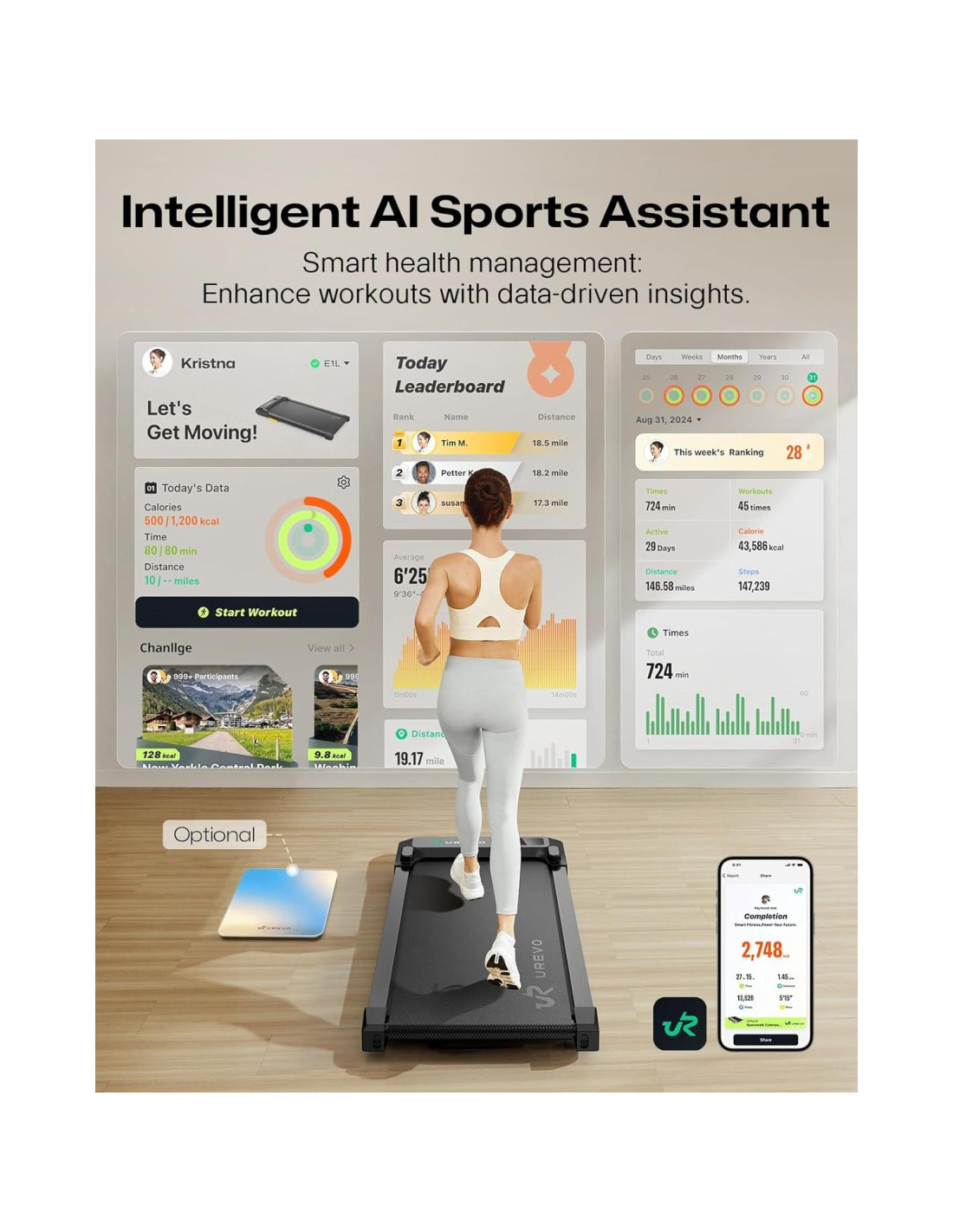 - Potente y Silencioso Motor de 2.5 Caballos de Fuerza Experimente la cinta de caminar inteligente UREVO, una cinta de correr inteligente para debajo del escritorio con un robusto motor silencioso de 2.5 HP que soporta hasta 109.8 kg de capacidad de peso. Diseñada para un ruido mínimo, la cinta de caminar inteligente UREVO es perfecta para uso en casa y oficina, permitiéndole mantenerse activo sin molestar su entorno. Su construcción duradera asegura un entrenamiento estable y confiable cada vez.