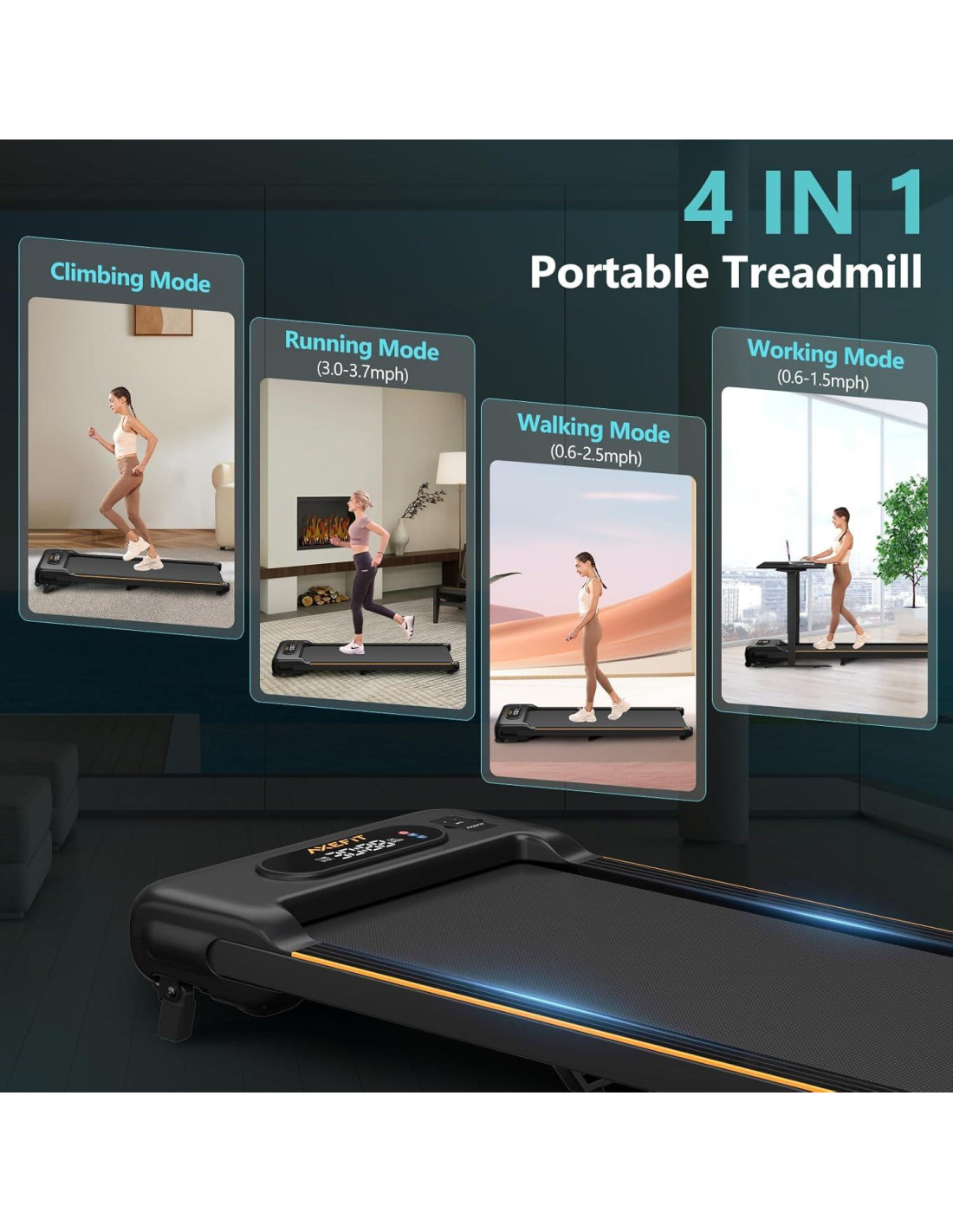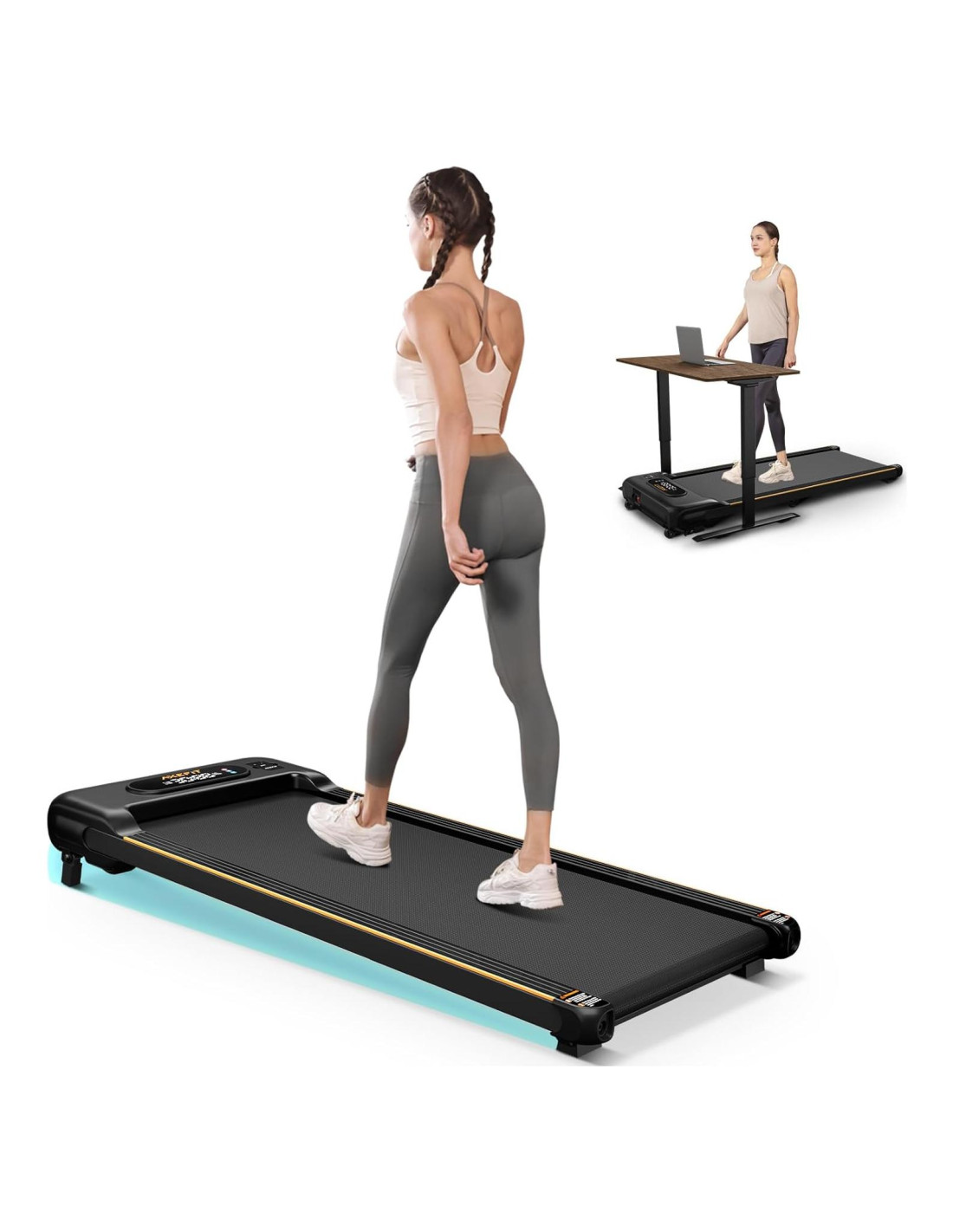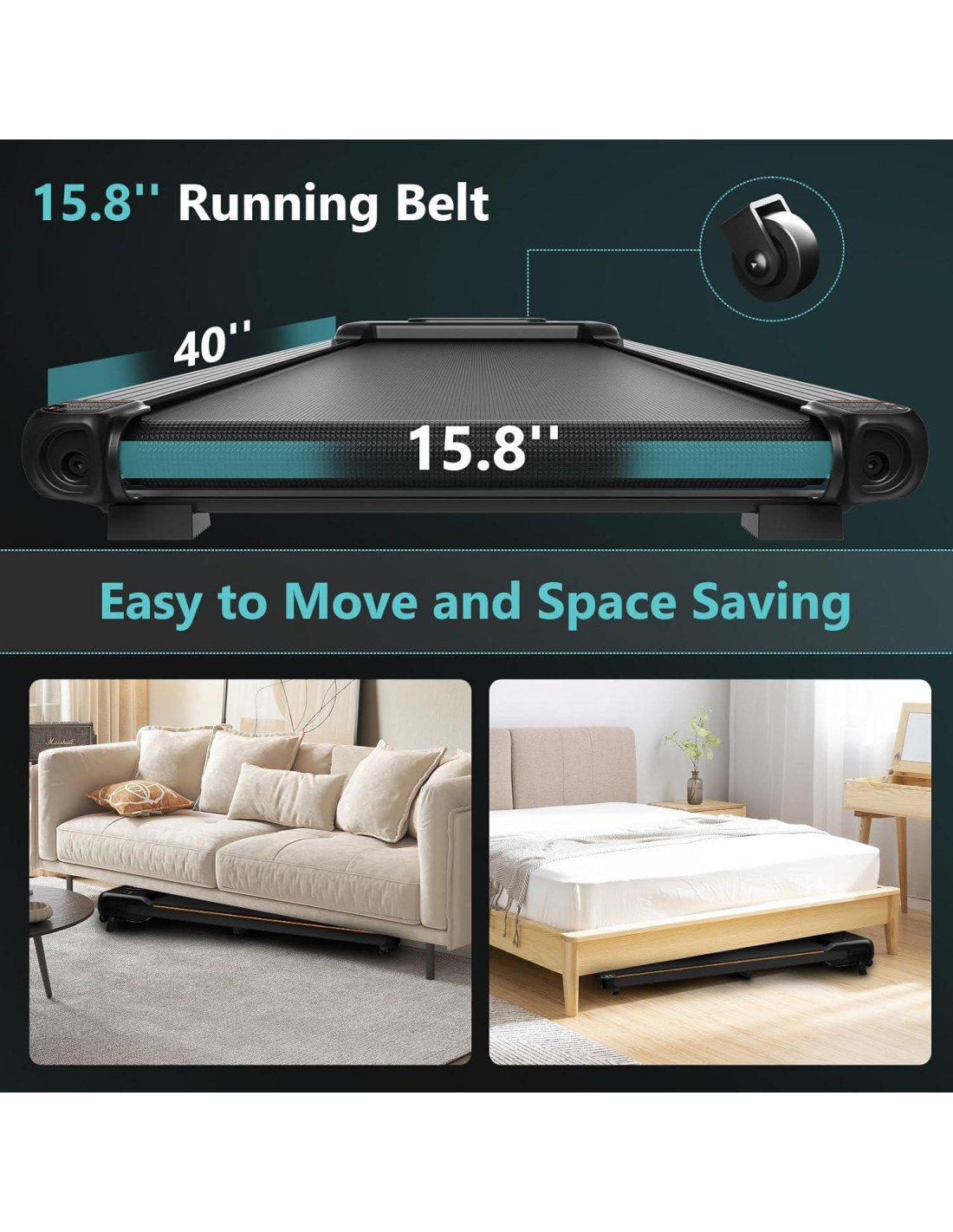 - Fácil de mover y almacenar - El grosor de nuestra caminadora compacta es de solo 13cm, lo que facilita su almacenamiento debajo del sofá, escritorio o cama, convirtiéndola en un gran ahorrador de espacio. La caminadora tiene dos ruedas en el lado frontal y la máquina pesa solo 16.8KG, por lo que incluso las chicas pueden moverla fácilmente a cualquier posición que deseen.