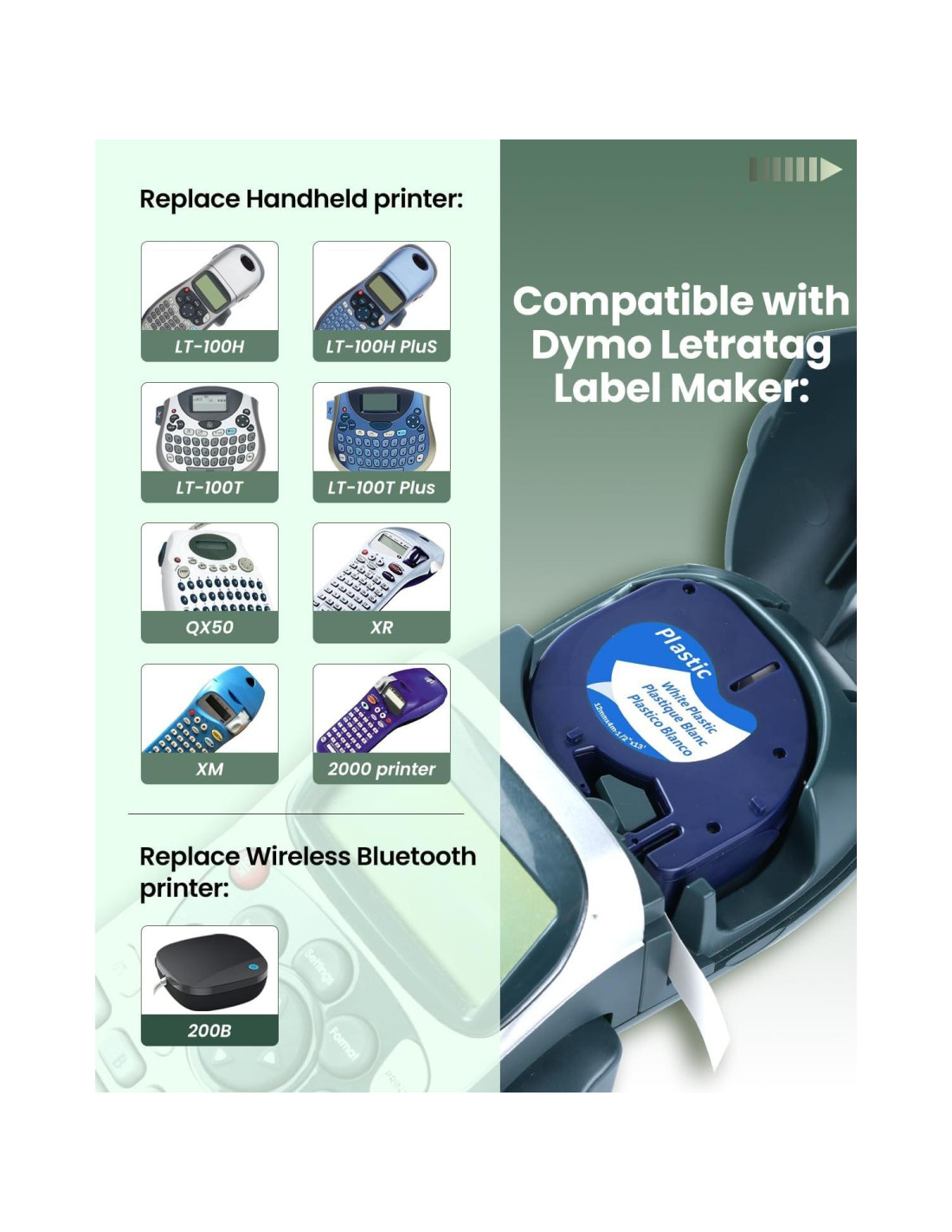 - Compatibilidad: Compatible con impresoras de etiquetas Dymo LetraTag LT-100H, LT 100H Plus, LT-100T, LT-100T Plus, 200B, QX50, XR, XM, 2000