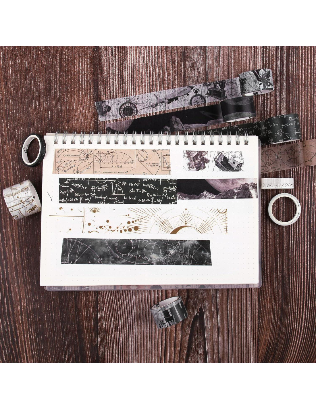 - 3. CINTA DE ENMASCARAMIENTO PARA MANUALIDADES: Despierta tu creatividad con nuestros conjuntos de cintas washi estéticas. Embellece tus cuadernos con ilustraciones misteriosas de galaxias, fases lunares, estrellas, constelaciones, espacio, astrología y cinta de tema gótico oscuro. Estas cintas washi serían un gran complemento para un tema steampunk.