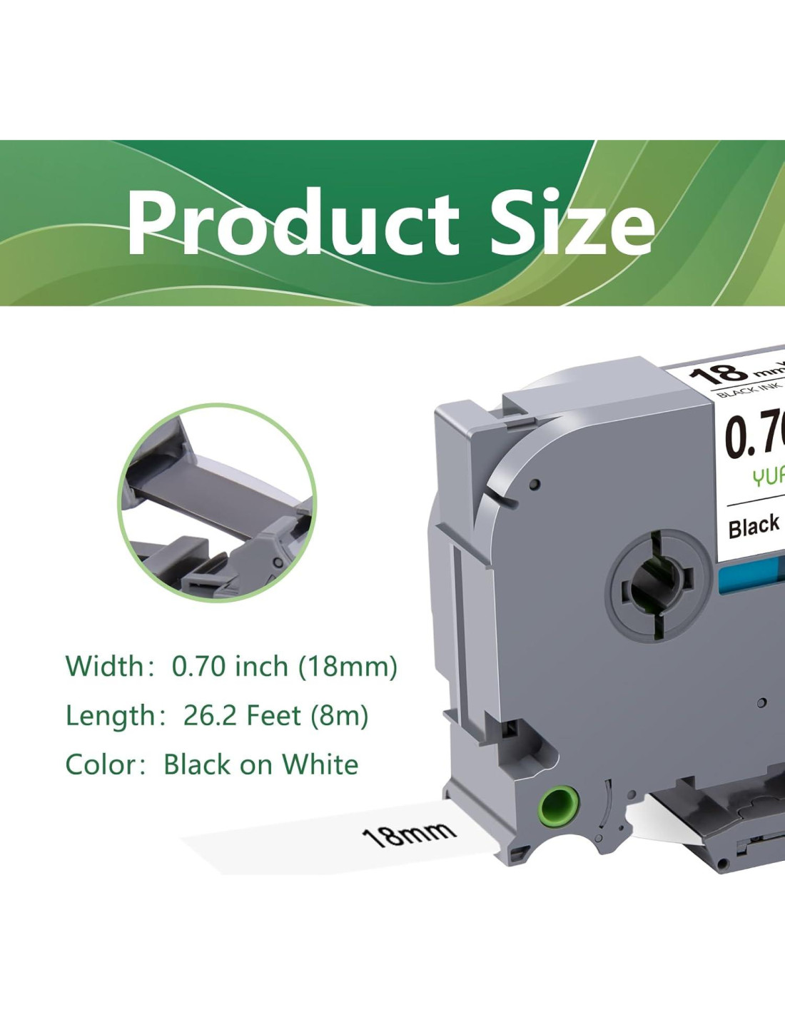 - Tamaño del producto: Color: negro sobre cinta blanca, Ancho: 3/4 pulgadas (18mm 0.7 pulgadas), Longitud: 26.2 pies (8m) para cada cinta de etiqueta laminada blanca