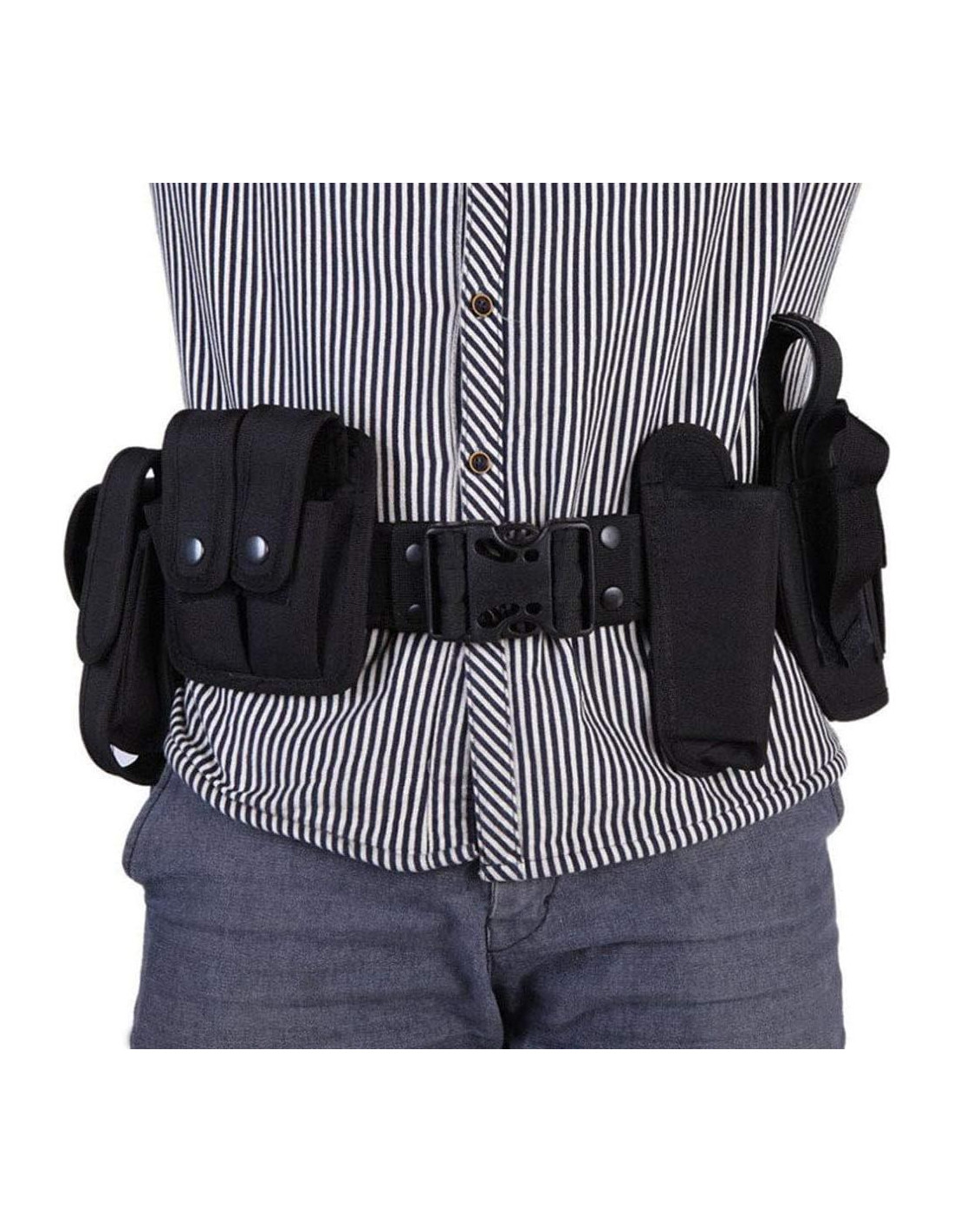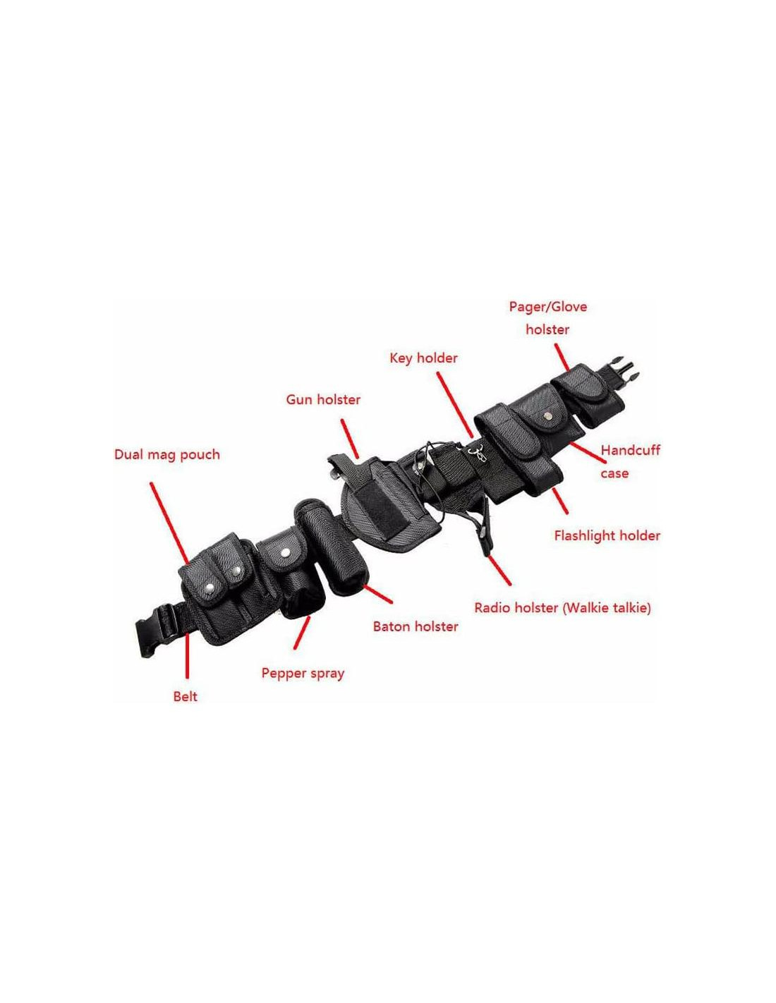 - Conjunto Táctico Completo: Incluye cinturón con hebilla, funda / bolsa para palo en forma de T, bolsa para preparación química / aerosol, bolsa para linterna, bolsa para walkie-talkie / teléfono móvil, caja para esposas, bolsa para bastón telescópico, bolsa de doble clip, llavero y banda de extensión.