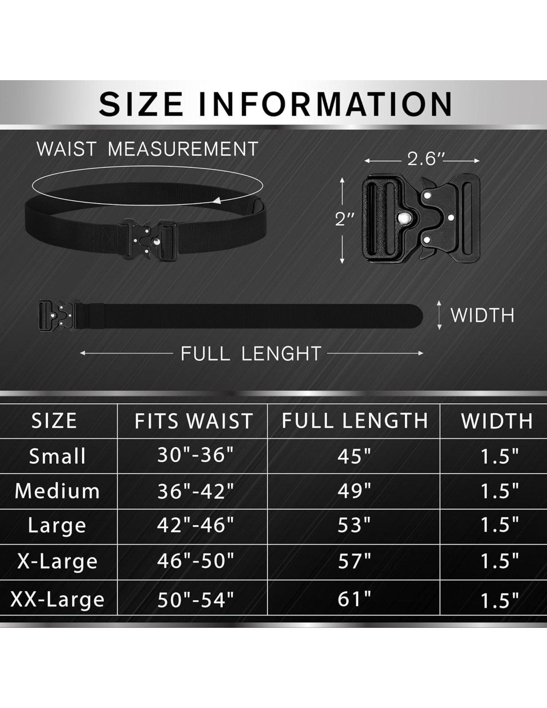 - Cinturón Táctico: Hebilla 3. Color: Negro. Tamaño: Mediano. Cintura 36"-42" (91-107 cm). Longitud 49" (124,46 cm). Ancho: 1.5" (39 mm).