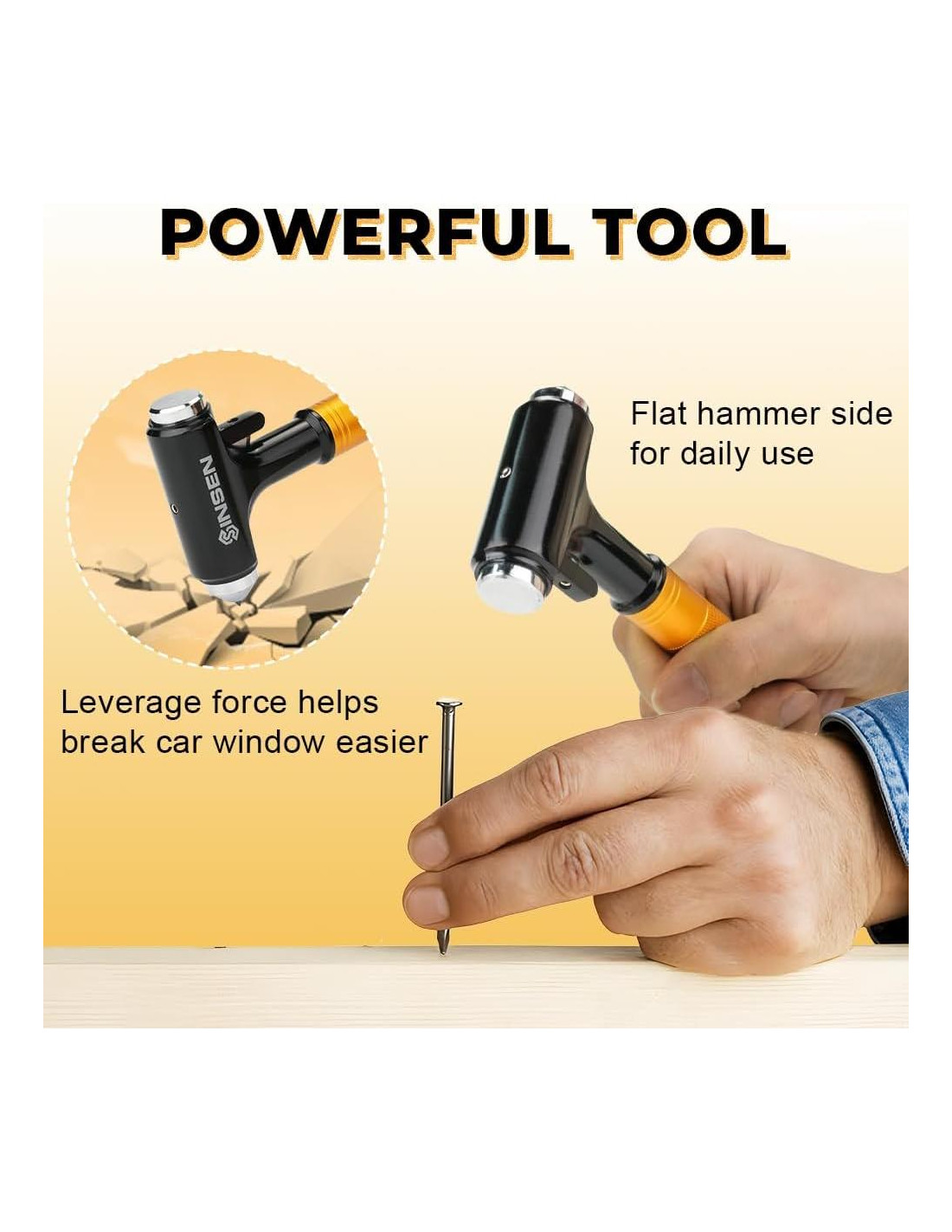 - Diseño amigable - El mango está diseñado con malla para un buen agarre, lo que puede ser fácil de controlar incluso si tu automóvil está sumergido en agua. La cabeza del martillo ponderada permite a los usuarios ejercer mayor fuerza con un esfuerzo mínimo.