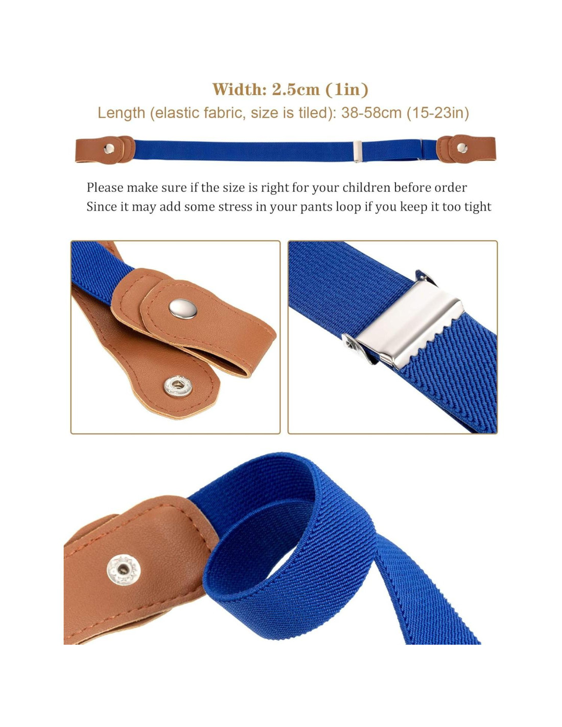 - Cinturones ajustables: el tamaño de cada cinturón infantil sin hebilla es aprox. 55 x 2.5 cm (21.65 x 0.98 pulgadas), el cinturón es ajustable gracias a la parte elástica, puede ajustar el tamaño de su hijo deslizando la varilla de metal para facilitar que los niños se lo pongan cuando van al baño