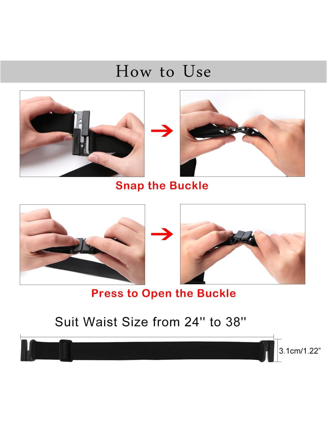 Con broche de ajuste, longitud de ajuste libre. Es tan conveniente y fácil de ajustar moviendo el broche de ajuste como una correa de sujetador para hacerlo más apretado o más suelto. Longitud total de la correa del cinturón: 24"-38" (61-96.5 cm), correa del cinturón 3.1 cm/1.22" (3.1 cm) de ancho.